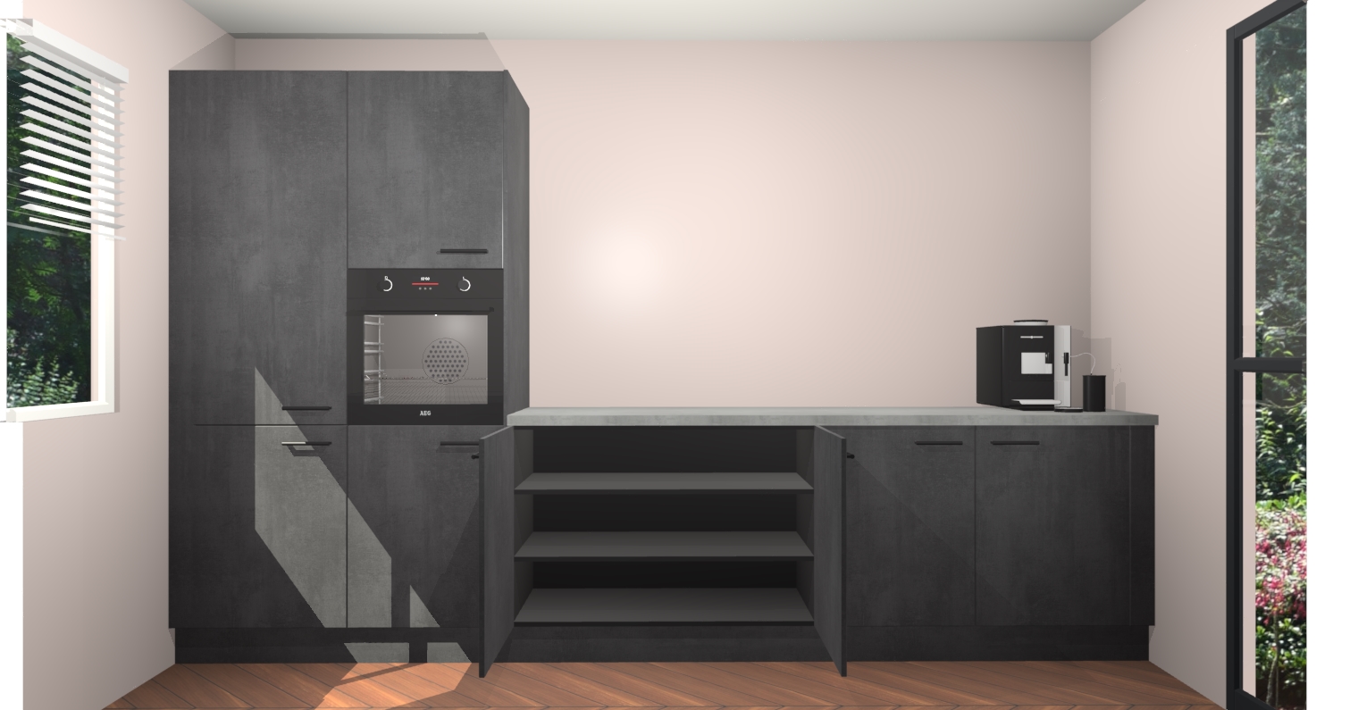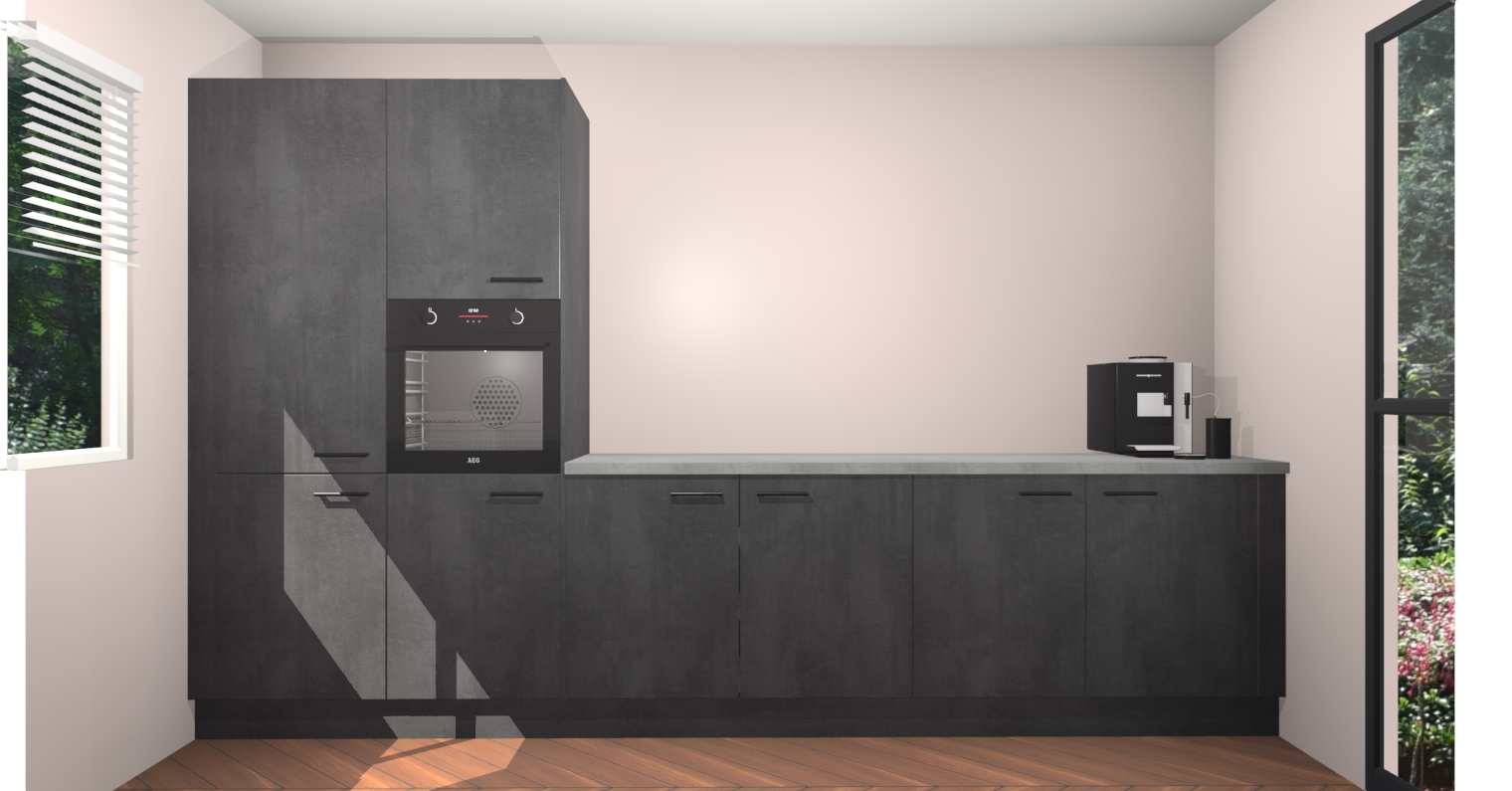 Welkom bij de Beton Zwarte keuken Lusaka. Deze prachtige keuken zal de komende jaren het middelpunt van de belangstelling in uw huis zijn. Uitgerust met vijf inbouwapparaten komt u nooit kookgereedschap tekort. Bovendien geeft de warme houtlook elke ruimte een uitnodigende en tijdloze uitstraling.