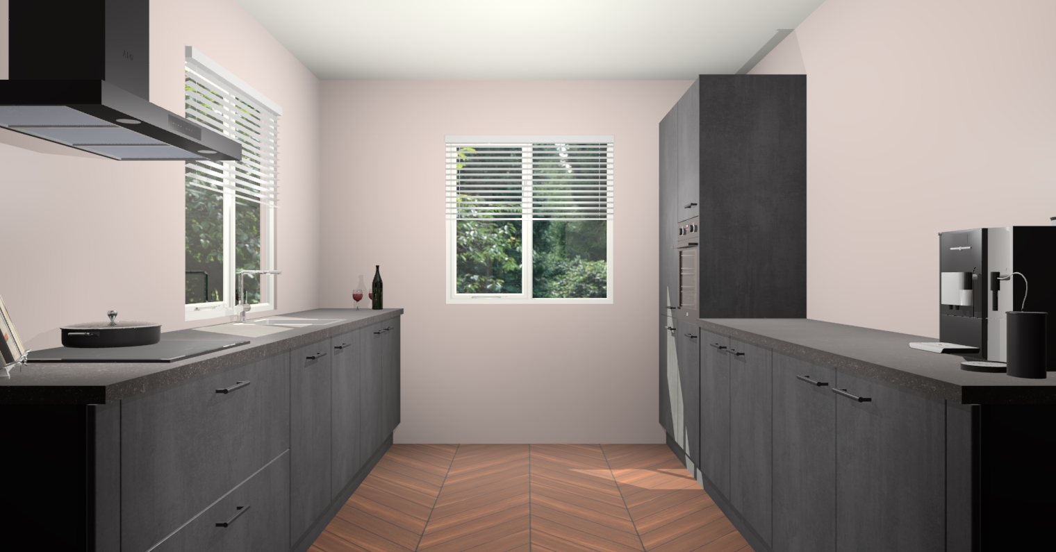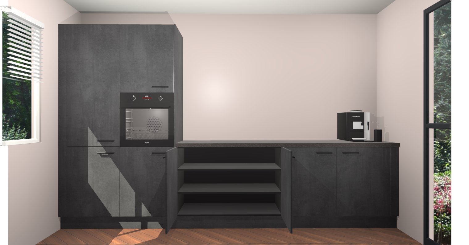 Welkom bij de Beton Zwarte keuken Lusaka. Deze prachtige keuken zal de komende jaren het middelpunt van de belangstelling in uw huis zijn. Uitgerust met vijf inbouwapparaten komt u nooit kookgereedschap tekort. Bovendien geeft de warme houtlook elke ruimte een uitnodigende en tijdloze uitstraling.