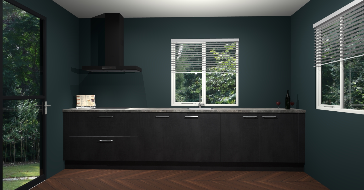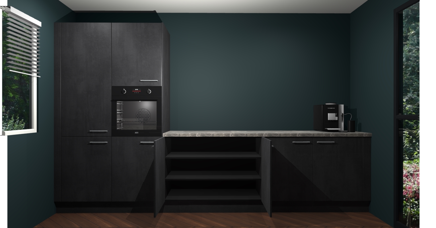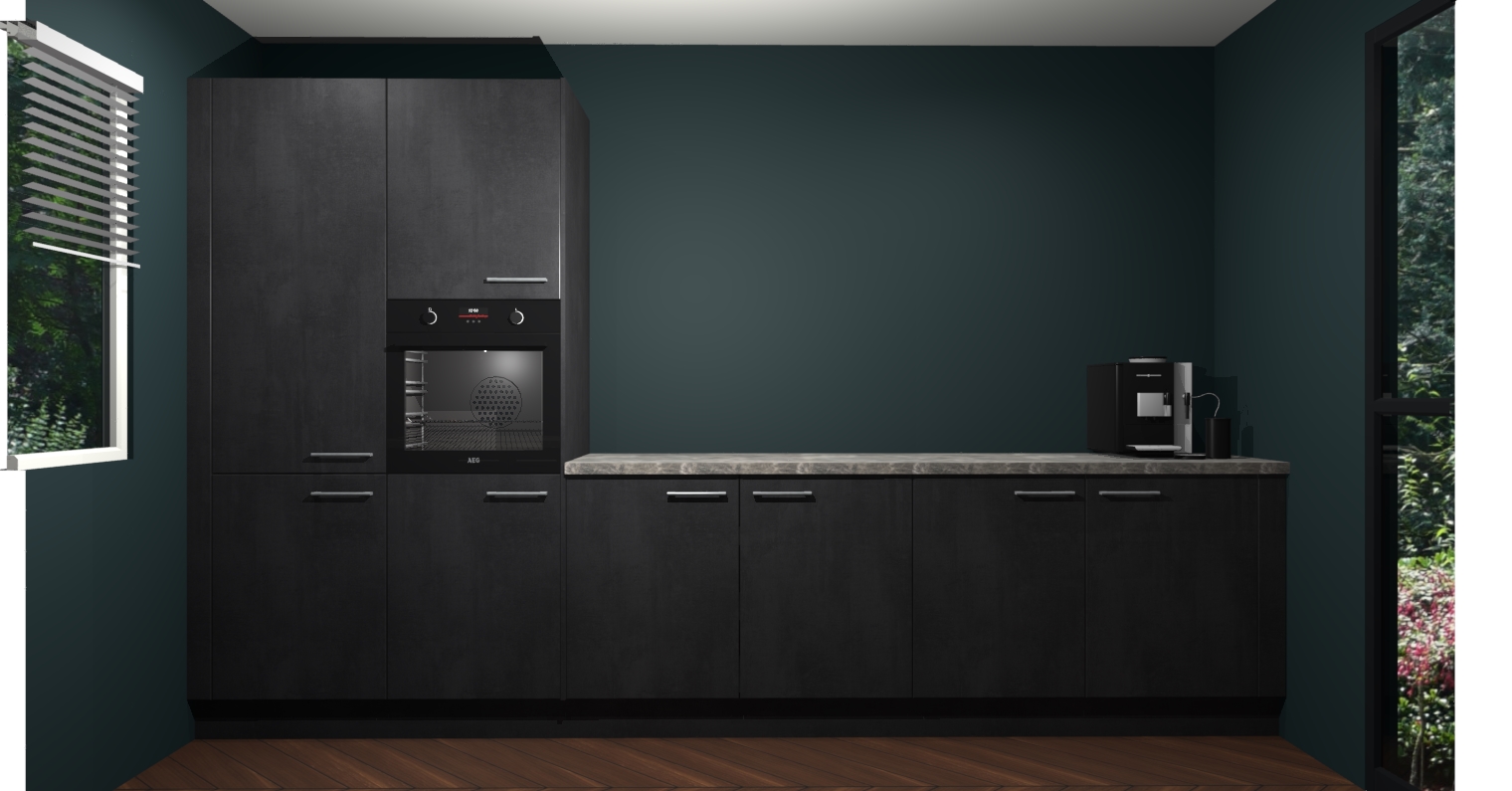 Welkom bij de Beton Zwarte keuken Lusaka. Deze prachtige keuken zal de komende jaren het middelpunt van de belangstelling in uw huis zijn. Uitgerust met vijf inbouwapparaten komt u nooit kookgereedschap tekort. Bovendien geeft de warme houtlook elke ruimte een uitnodigende en tijdloze uitstraling.