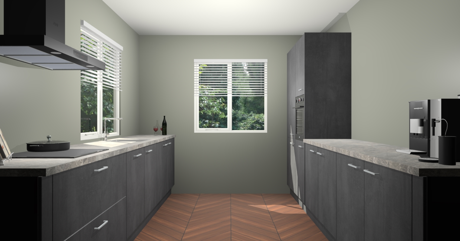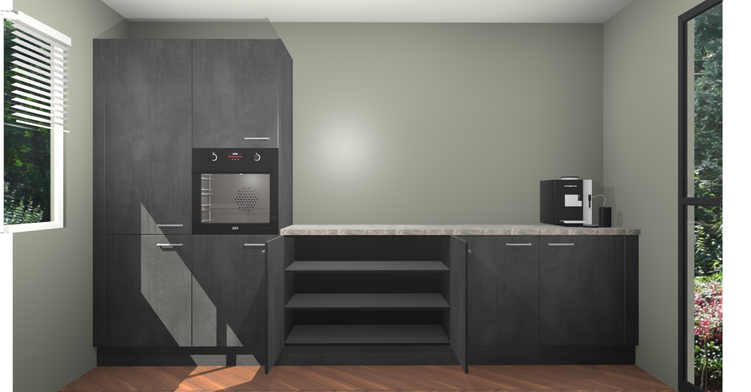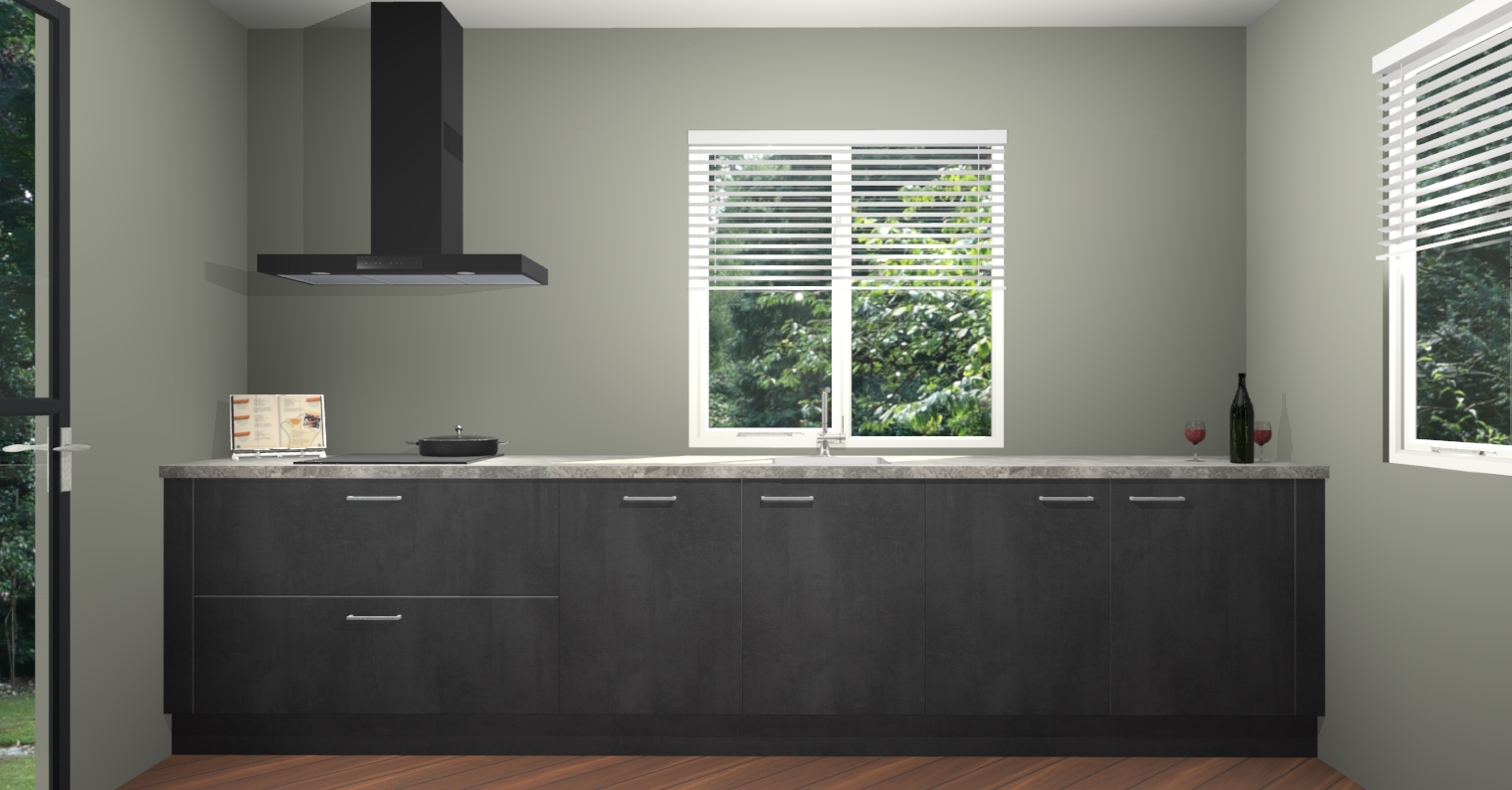 Welkom bij de Beton Zwarte keuken Lusaka. Deze prachtige keuken zal de komende jaren het middelpunt van de belangstelling in uw huis zijn. Uitgerust met vijf inbouwapparaten komt u nooit kookgereedschap tekort. Bovendien geeft de warme houtlook elke ruimte een uitnodigende en tijdloze uitstraling.