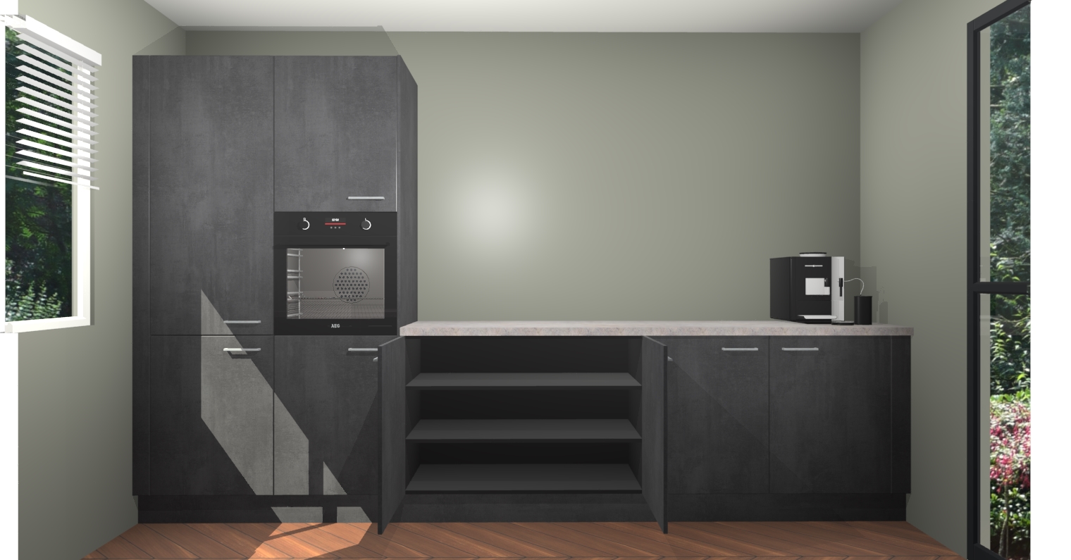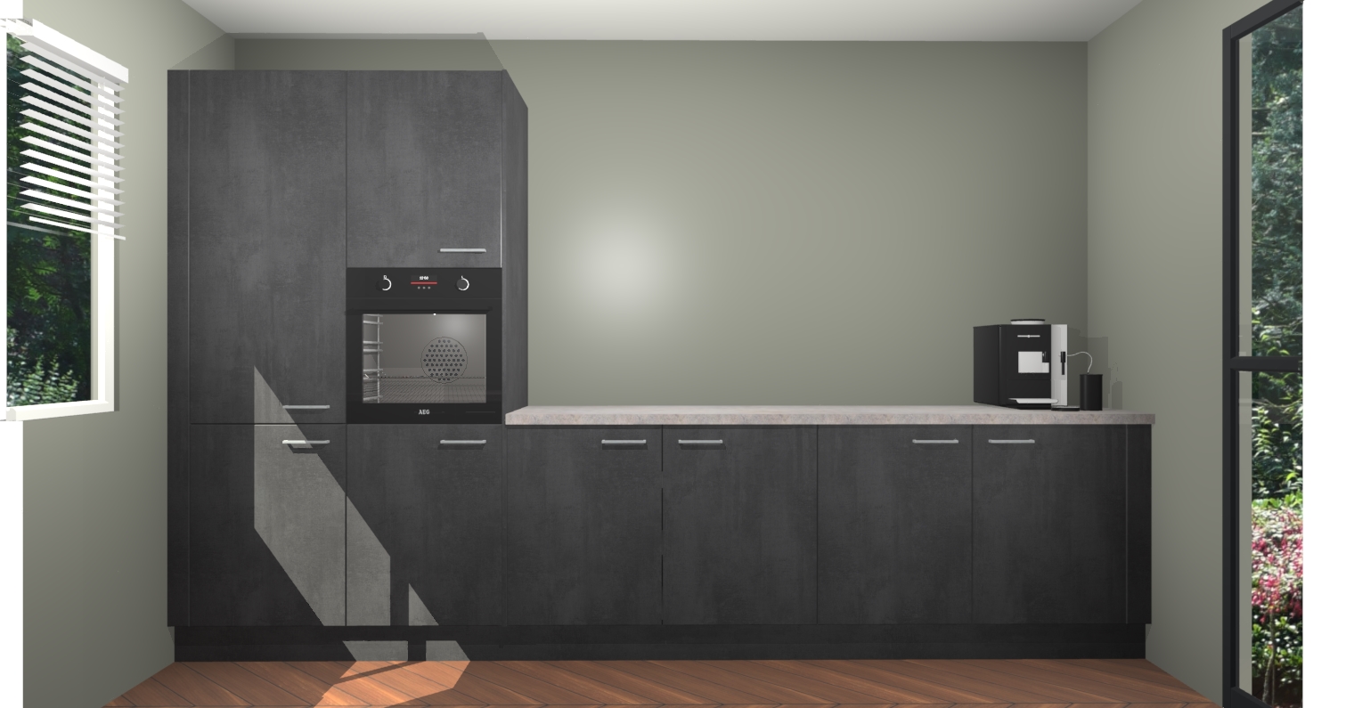 Welkom bij de Beton Zwarte keuken Lusaka. Deze prachtige keuken zal de komende jaren het middelpunt van de belangstelling in uw huis zijn. Uitgerust met vijf inbouwapparaten komt u nooit kookgereedschap tekort. Bovendien geeft de warme houtlook elke ruimte een uitnodigende en tijdloze uitstraling.