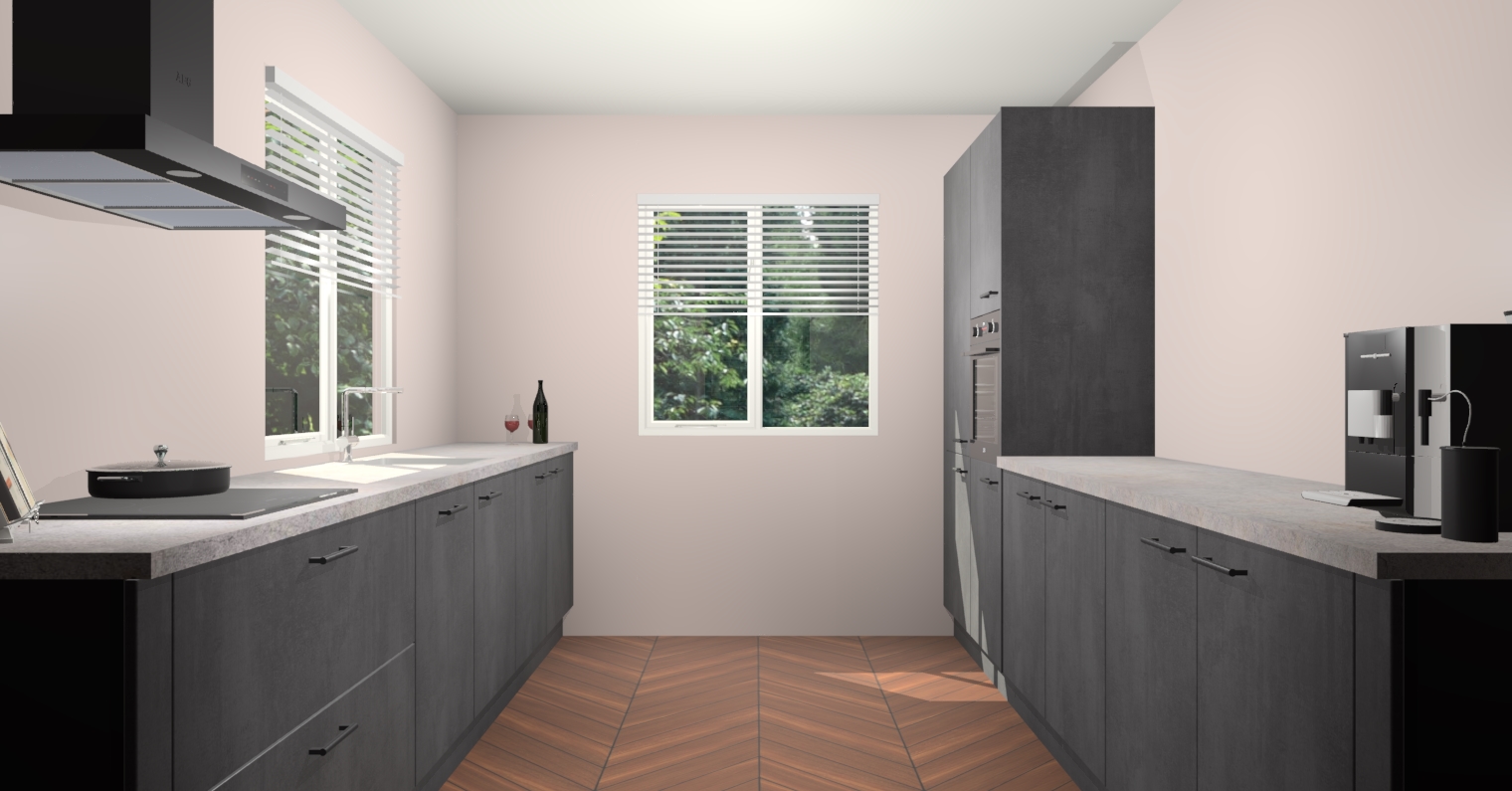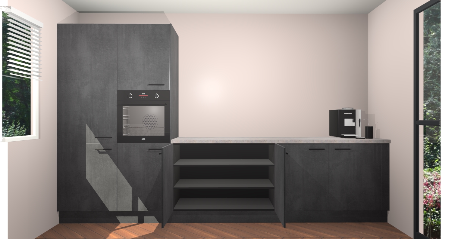 Welkom bij de Beton Zwarte keuken Lusaka. Deze prachtige keuken zal de komende jaren het middelpunt van de belangstelling in uw huis zijn. Uitgerust met vijf inbouwapparaten komt u nooit kookgereedschap tekort. Bovendien geeft de warme houtlook elke ruimte een uitnodigende en tijdloze uitstraling.