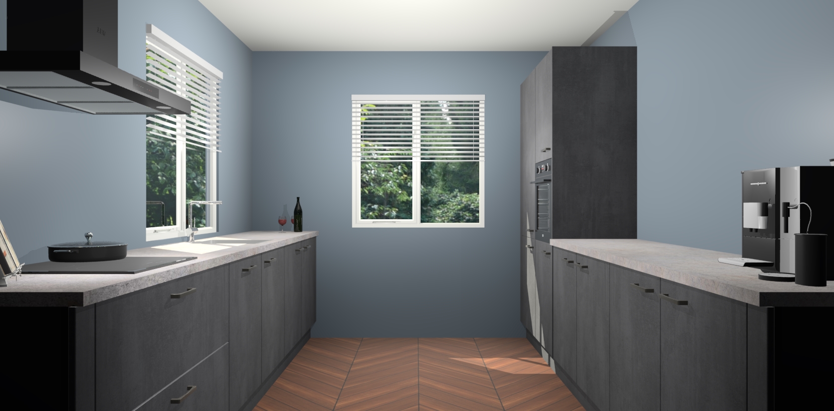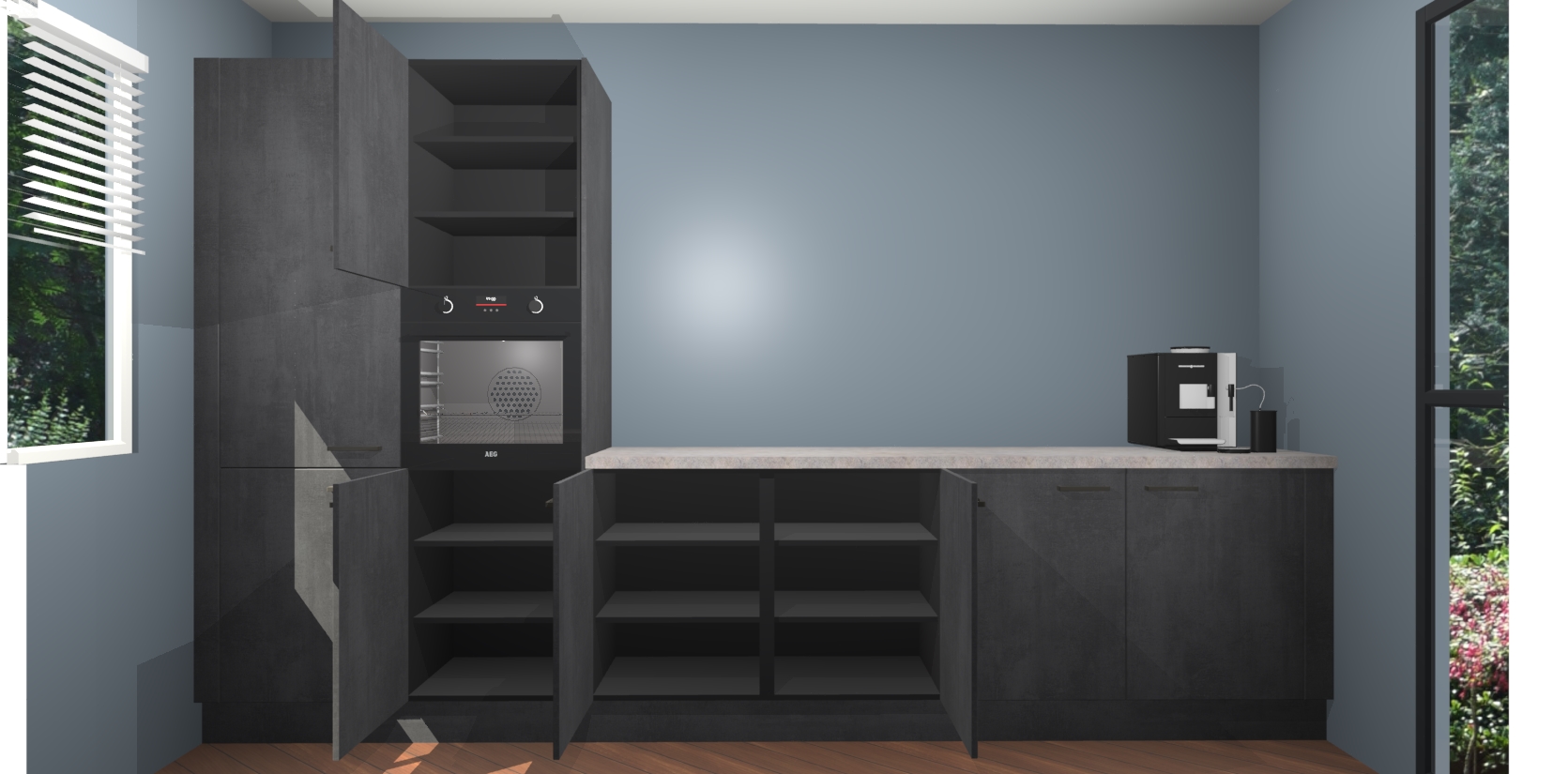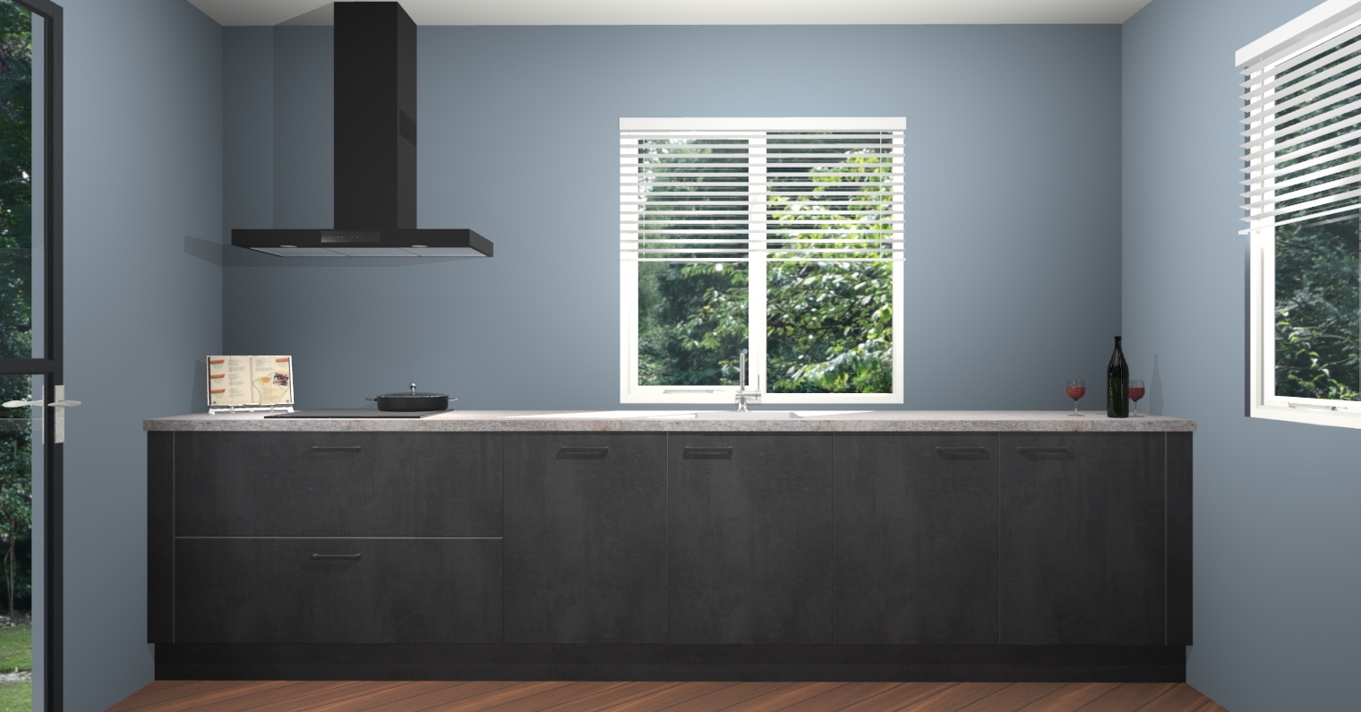 Welkom bij de Beton Zwarte keuken Lusaka. Deze prachtige keuken zal de komende jaren het middelpunt van de belangstelling in uw huis zijn. Uitgerust met vijf inbouwapparaten komt u nooit kookgereedschap tekort. Bovendien geeft de warme houtlook elke ruimte een uitnodigende en tijdloze uitstraling.
