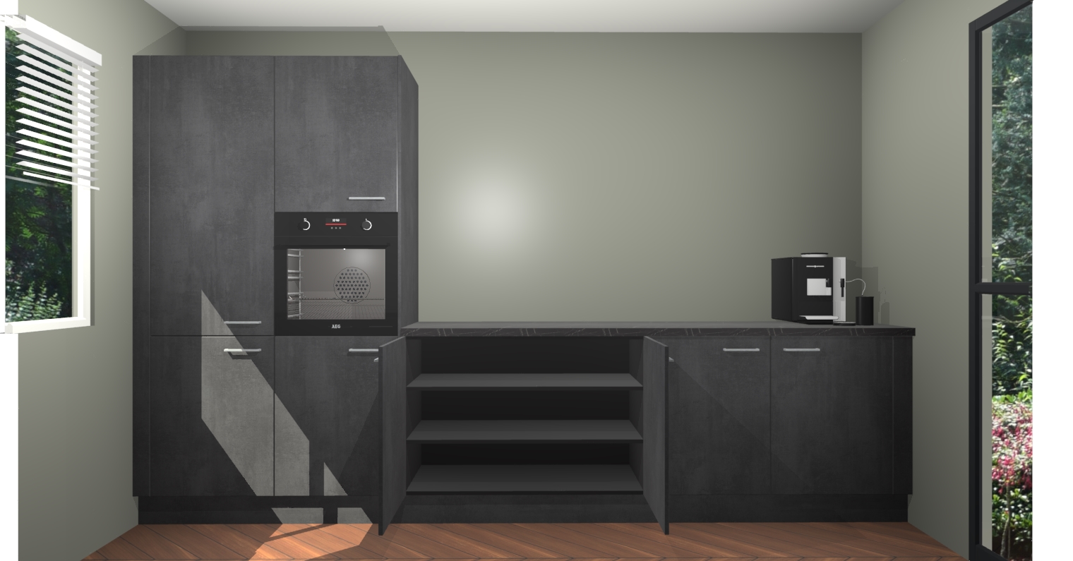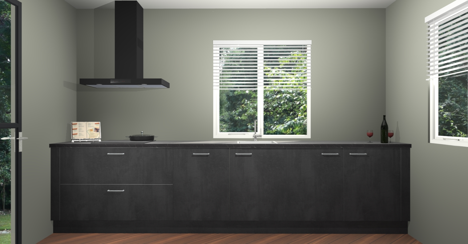 Welkom bij de Beton Zwarte keuken Lusaka. Deze prachtige keuken zal de komende jaren het middelpunt van de belangstelling in uw huis zijn. Uitgerust met vijf inbouwapparaten komt u nooit kookgereedschap tekort. Bovendien geeft de warme houtlook elke ruimte een uitnodigende en tijdloze uitstraling.