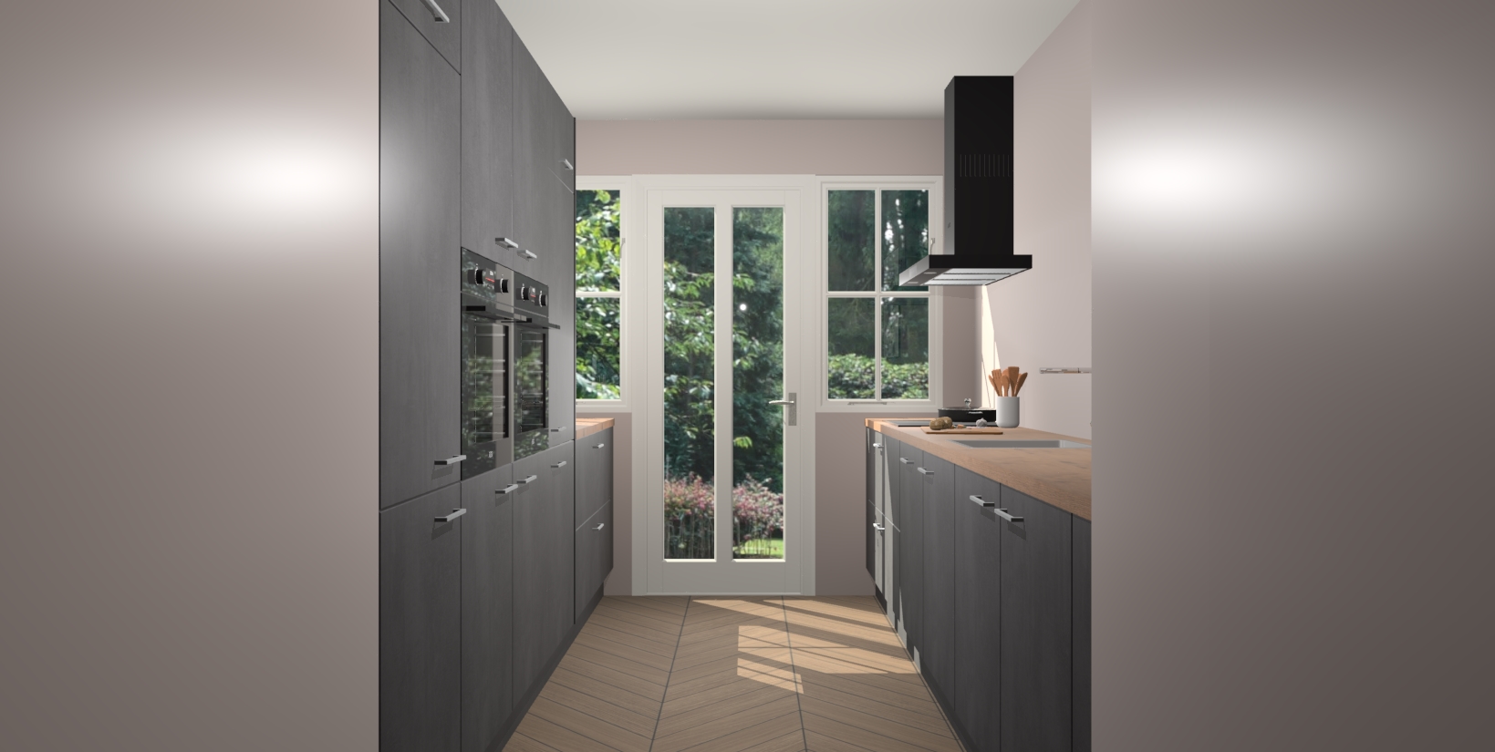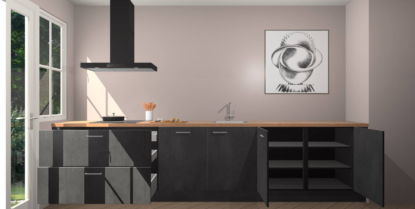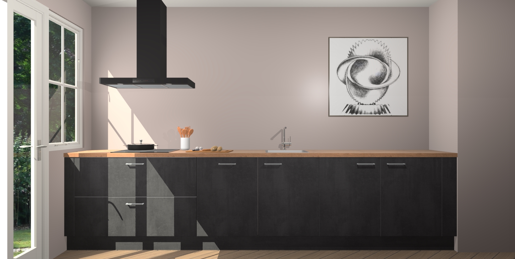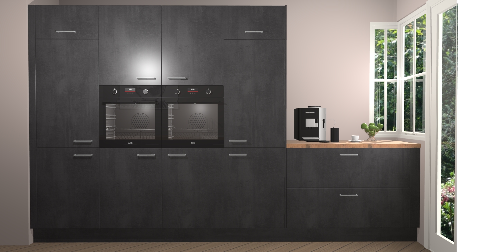 Een stijlvolle en praktische keuken als deze mag gezien worden. Dankzij de prachtige beton zwarte matte afwerking wordt de keuken gemakkelijk het middelpunt van uw huis - hij ziet er geweldig uit onder allerlei lichtomstandigheden, van dag tot nacht!