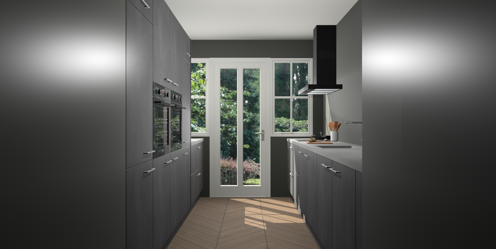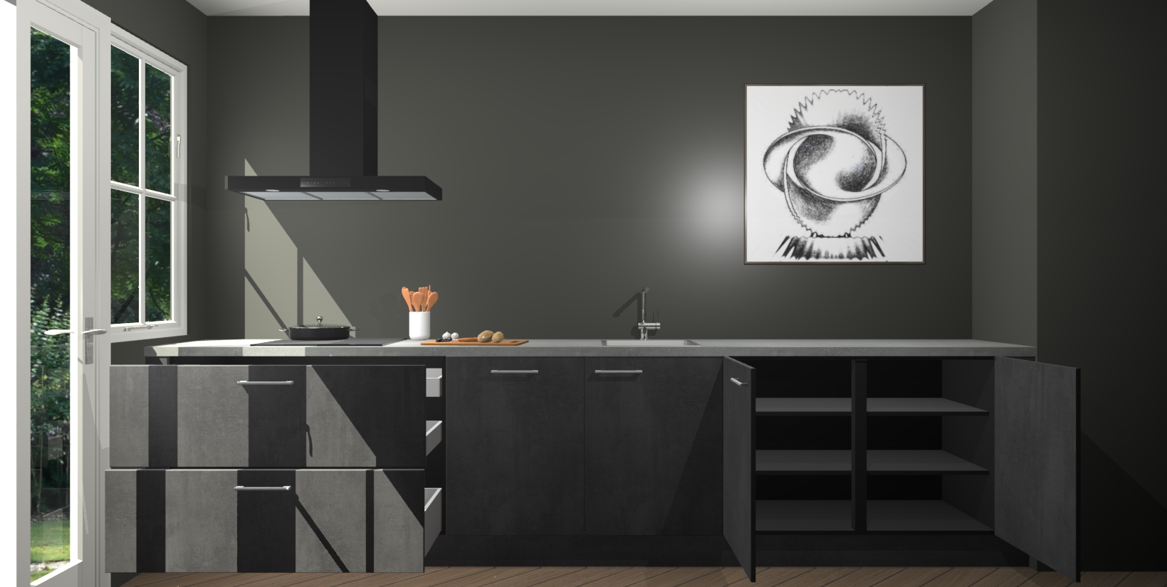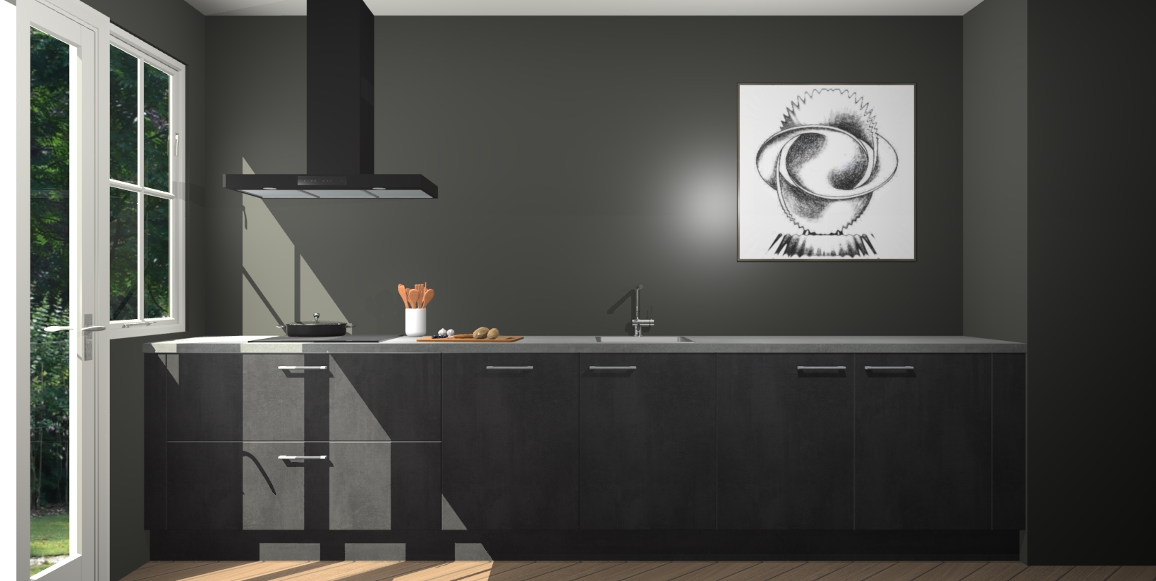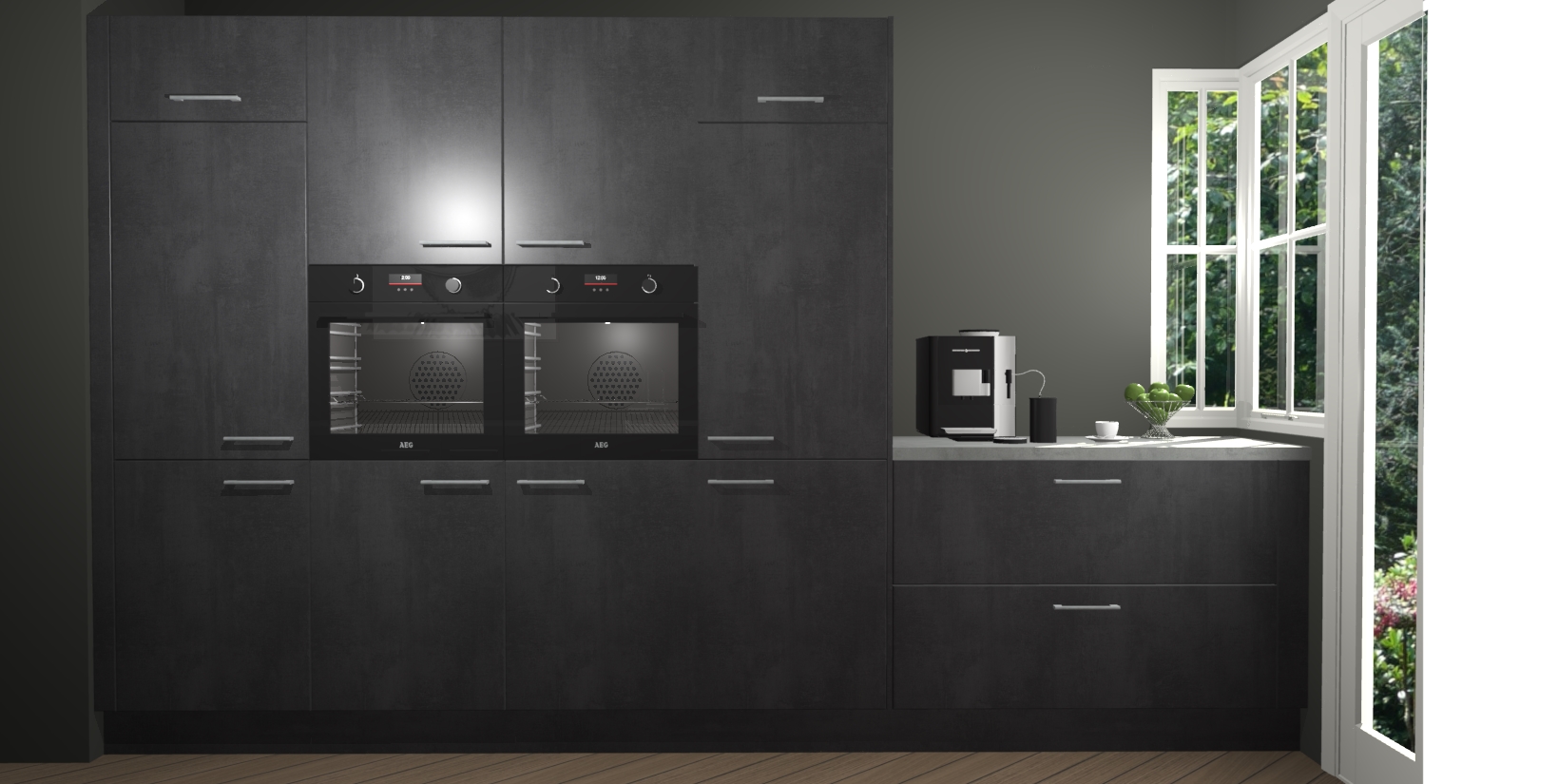 Een stijlvolle en praktische keuken als deze mag gezien worden. Dankzij de prachtige beton zwarte matte afwerking wordt de keuken gemakkelijk het middelpunt van uw huis - hij ziet er geweldig uit onder allerlei lichtomstandigheden, van dag tot nacht!