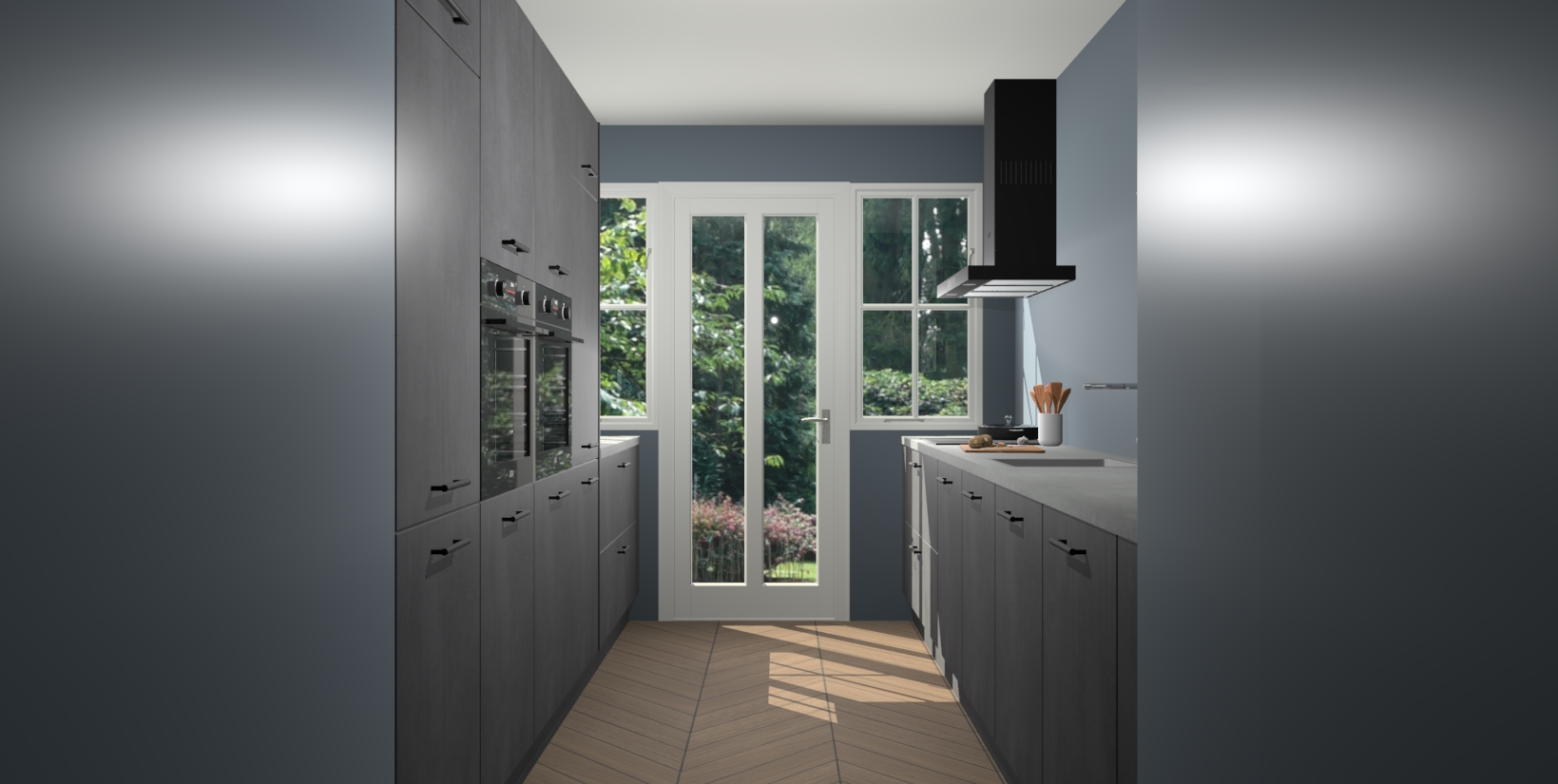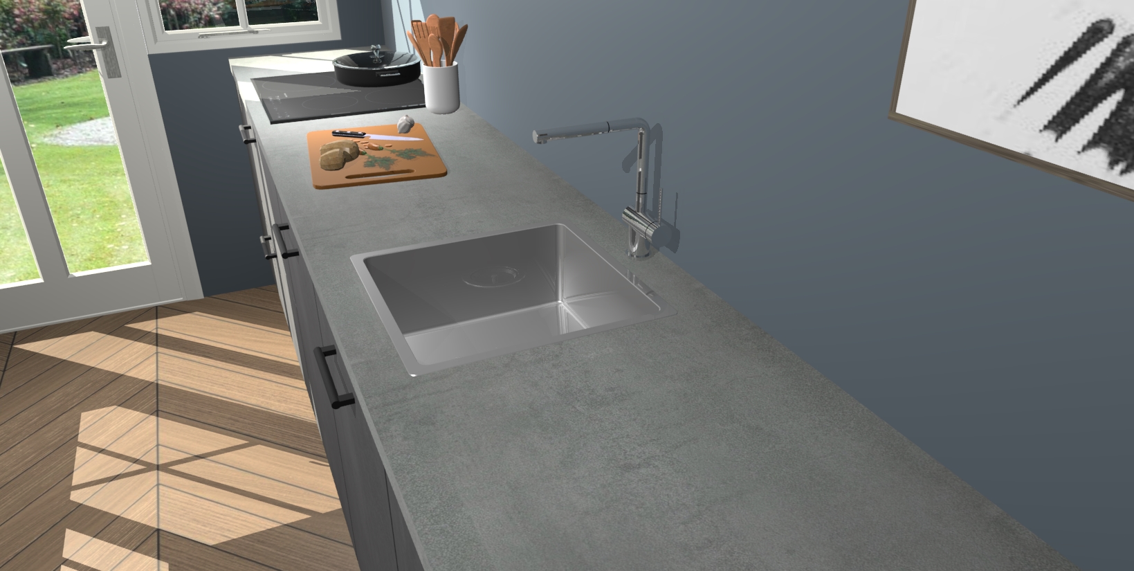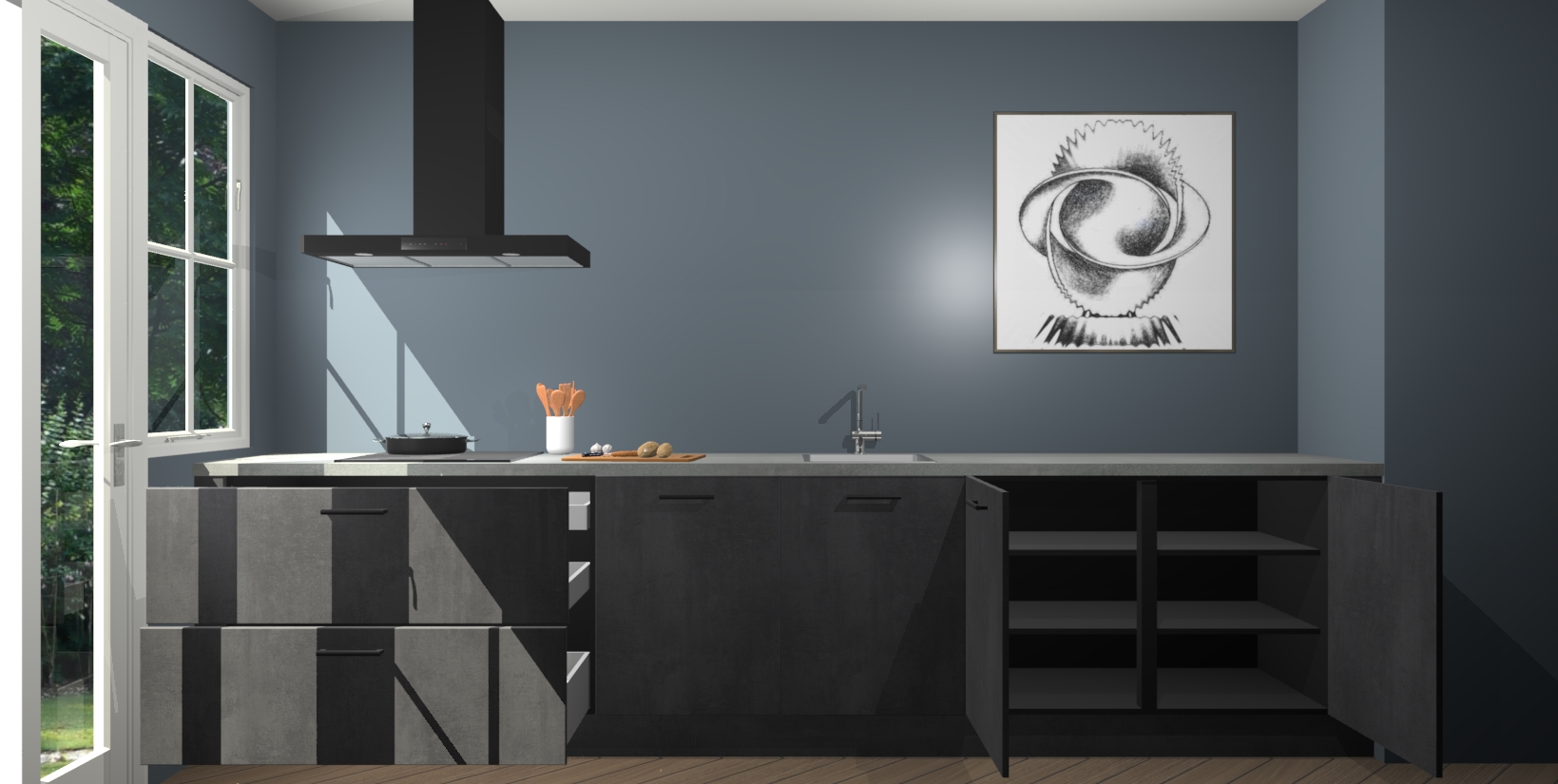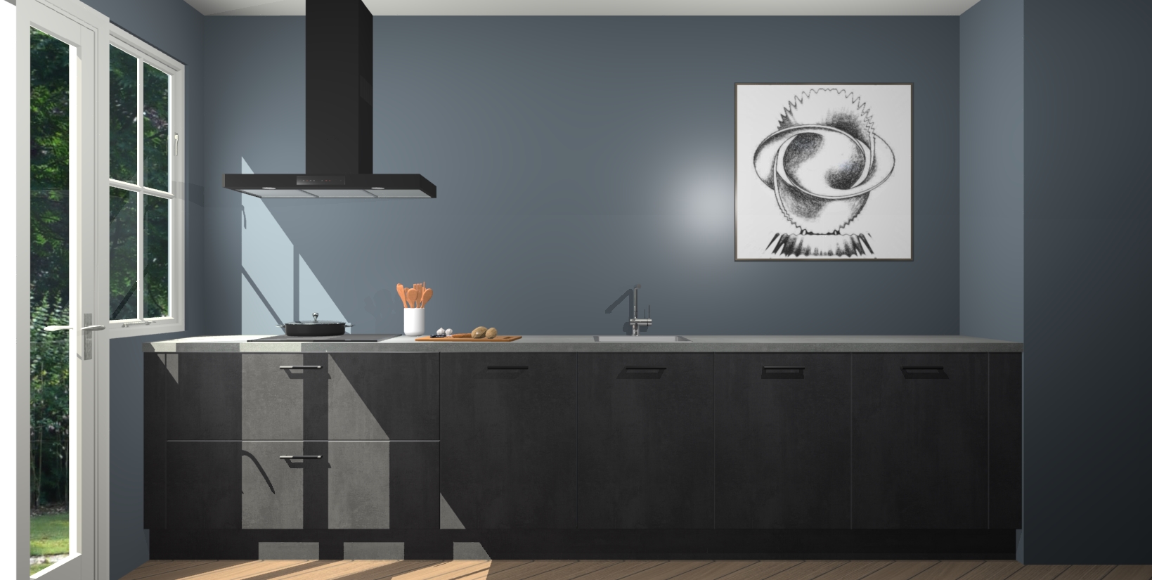 Een stijlvolle en praktische keuken als deze mag gezien worden. Dankzij de prachtige beton zwarte matte afwerking wordt de keuken gemakkelijk het middelpunt van uw huis - hij ziet er geweldig uit onder allerlei lichtomstandigheden, van dag tot nacht!