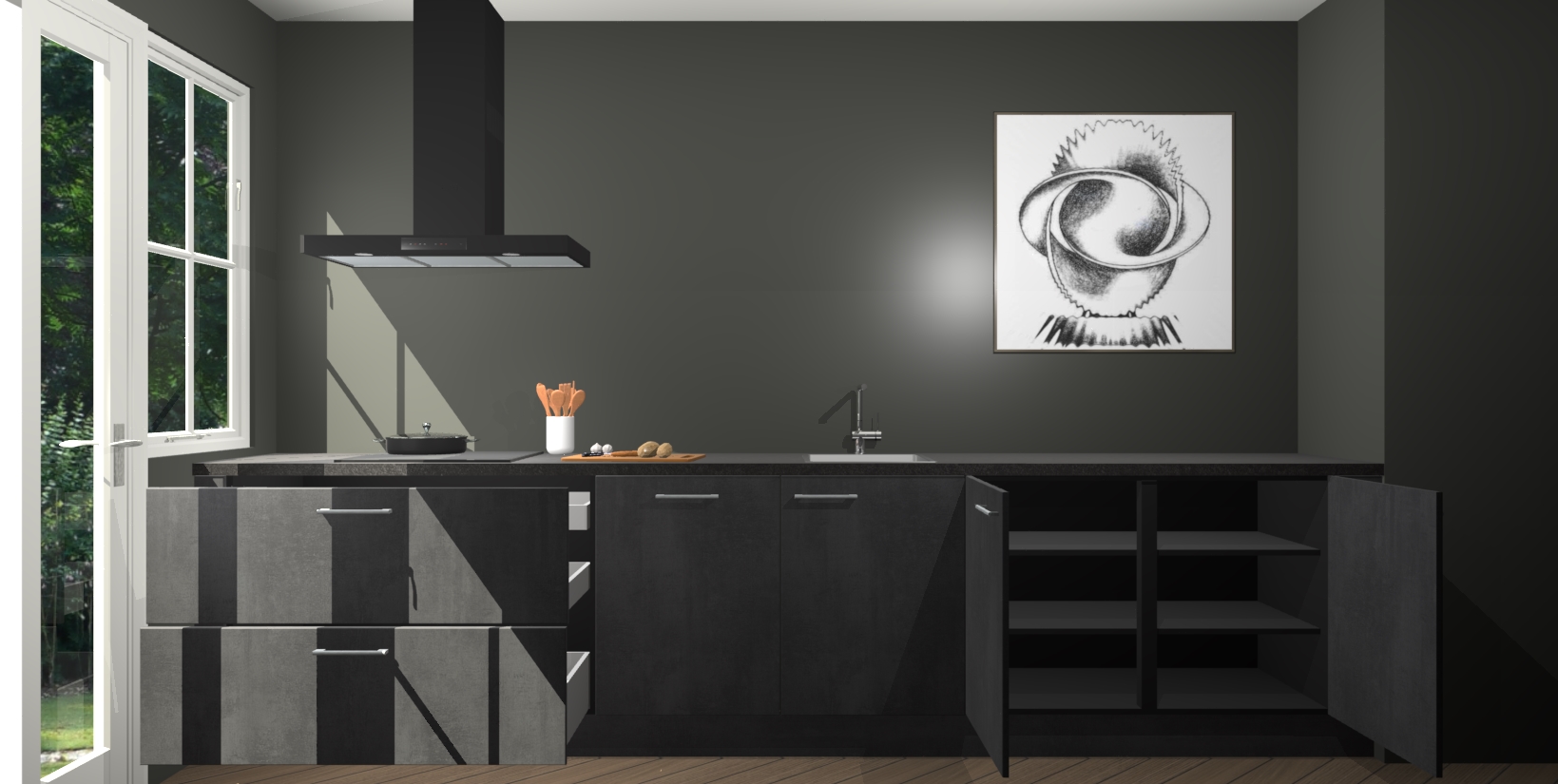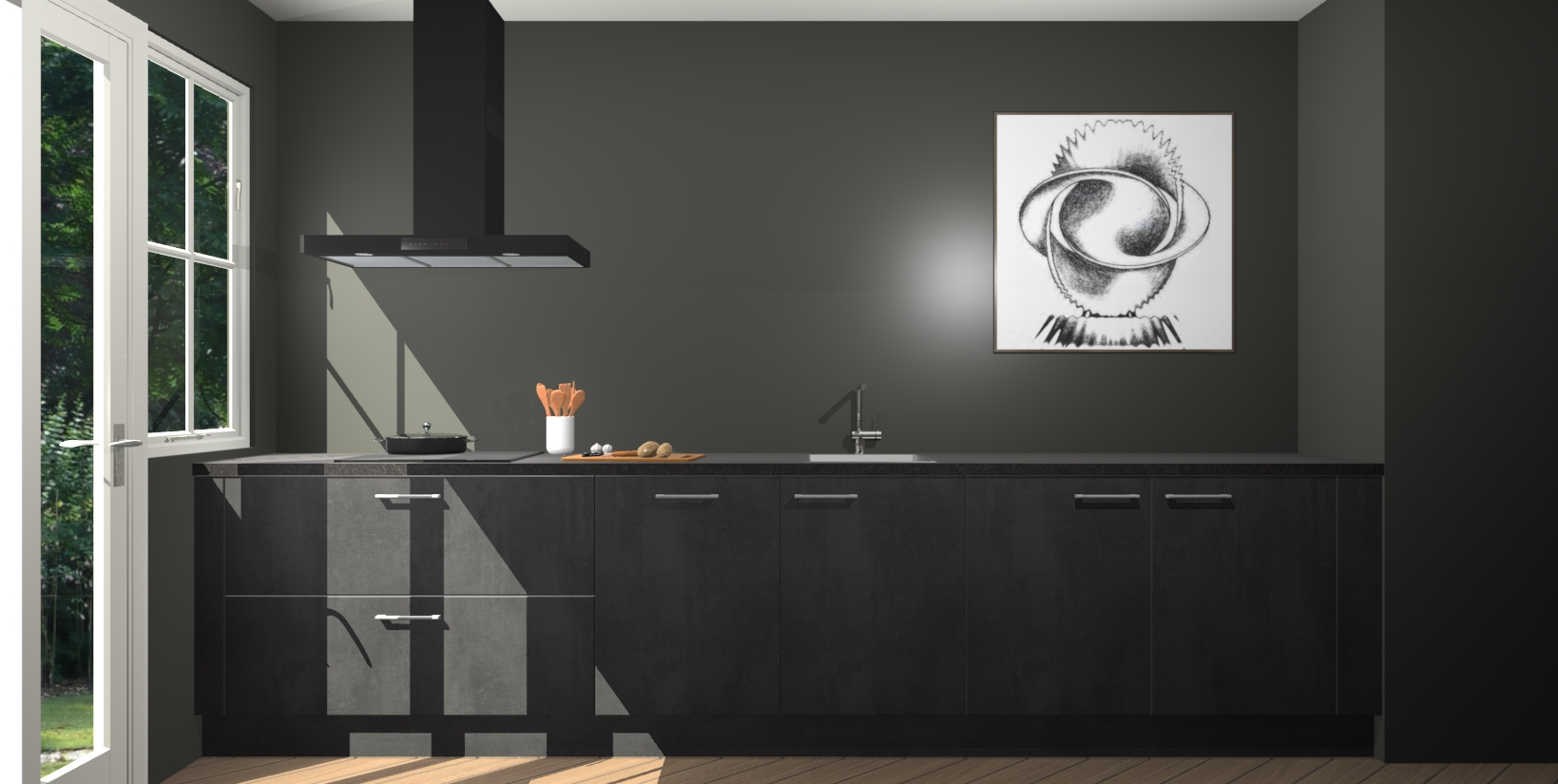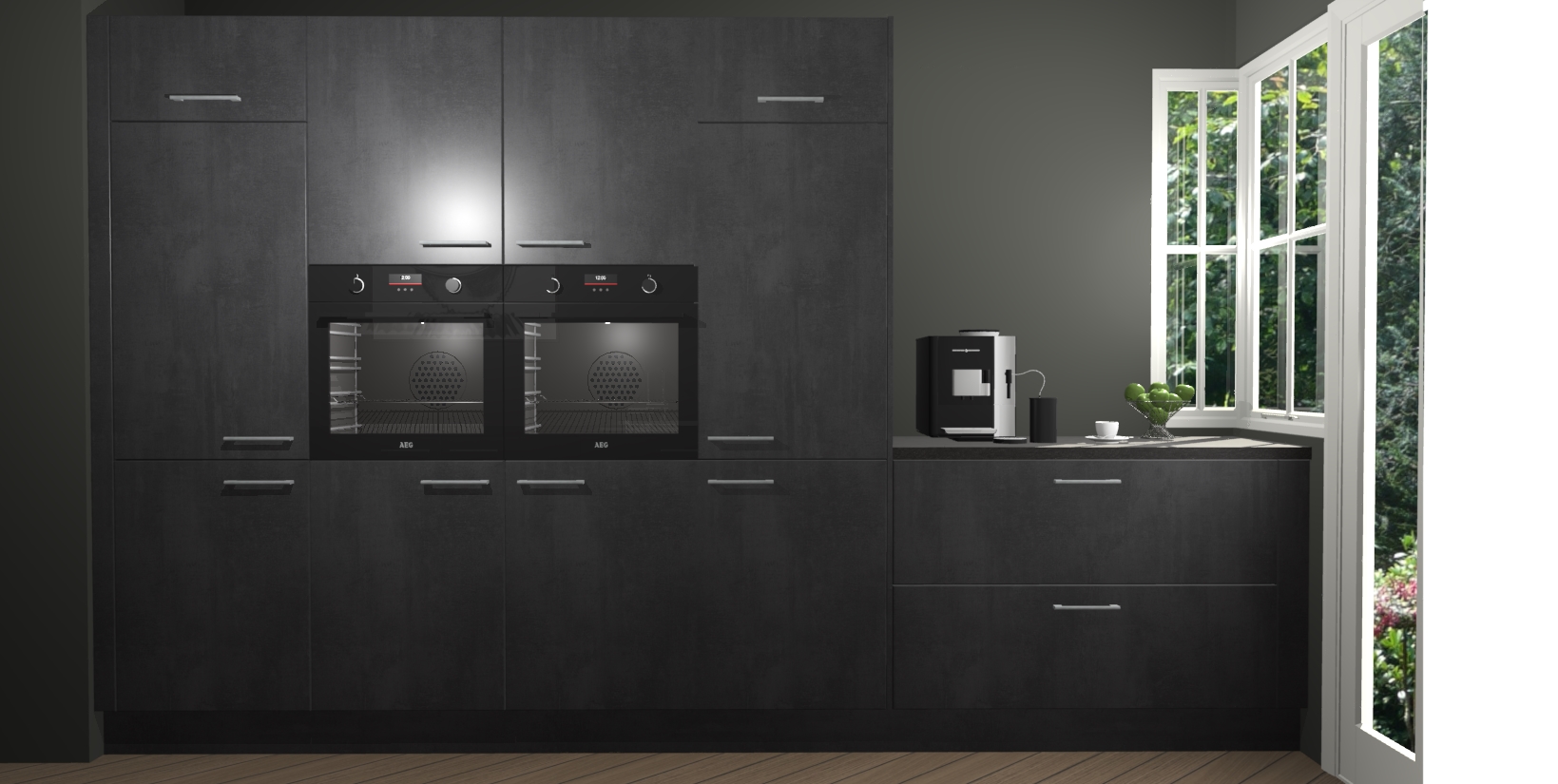 Een stijlvolle en praktische keuken als deze mag gezien worden. Dankzij de prachtige beton zwarte matte afwerking wordt de keuken gemakkelijk het middelpunt van uw huis - hij ziet er geweldig uit onder allerlei lichtomstandigheden, van dag tot nacht!