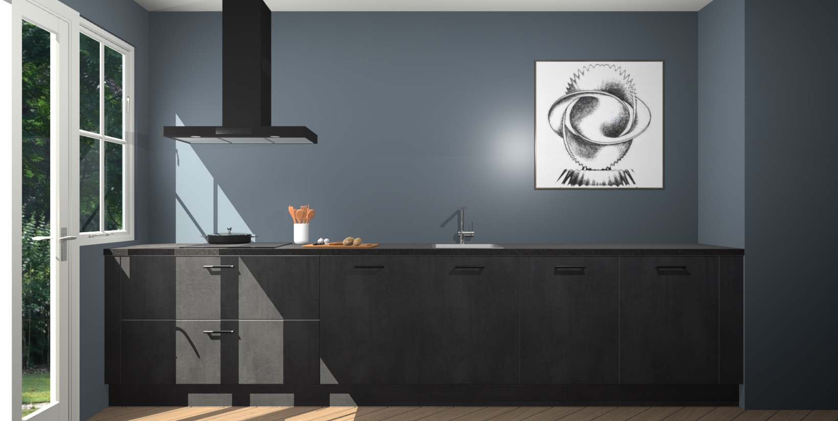 Een stijlvolle en praktische keuken als deze mag gezien worden. Dankzij de prachtige beton zwarte matte afwerking wordt de keuken gemakkelijk het middelpunt van uw huis - hij ziet er geweldig uit onder allerlei lichtomstandigheden, van dag tot nacht!