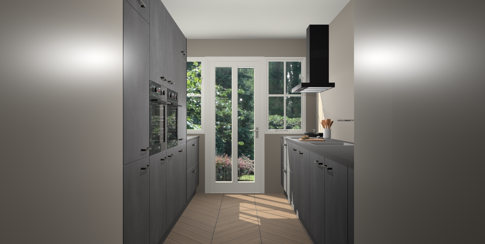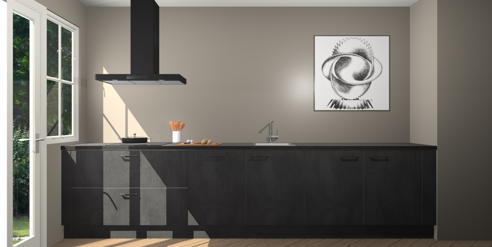 Een stijlvolle en praktische keuken als deze mag gezien worden. Dankzij de prachtige beton zwarte matte afwerking wordt de keuken gemakkelijk het middelpunt van uw huis - hij ziet er geweldig uit onder allerlei lichtomstandigheden, van dag tot nacht!