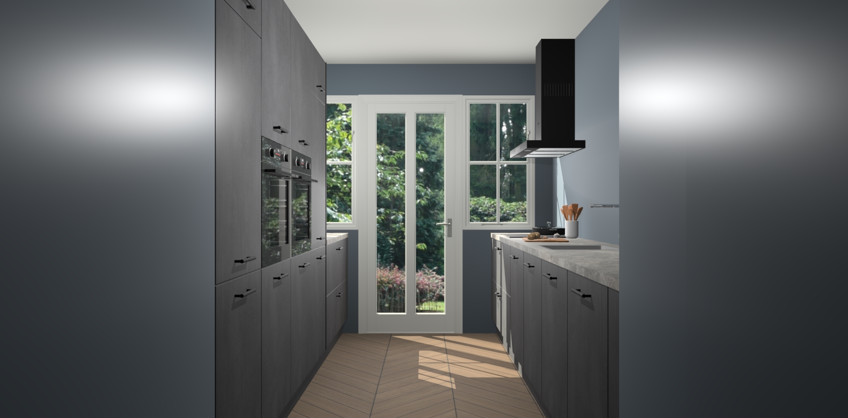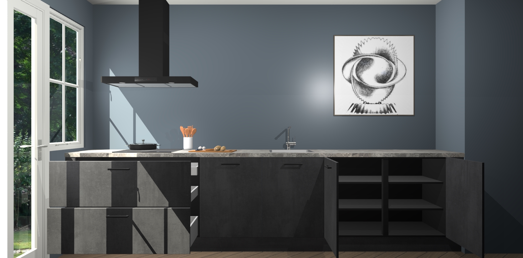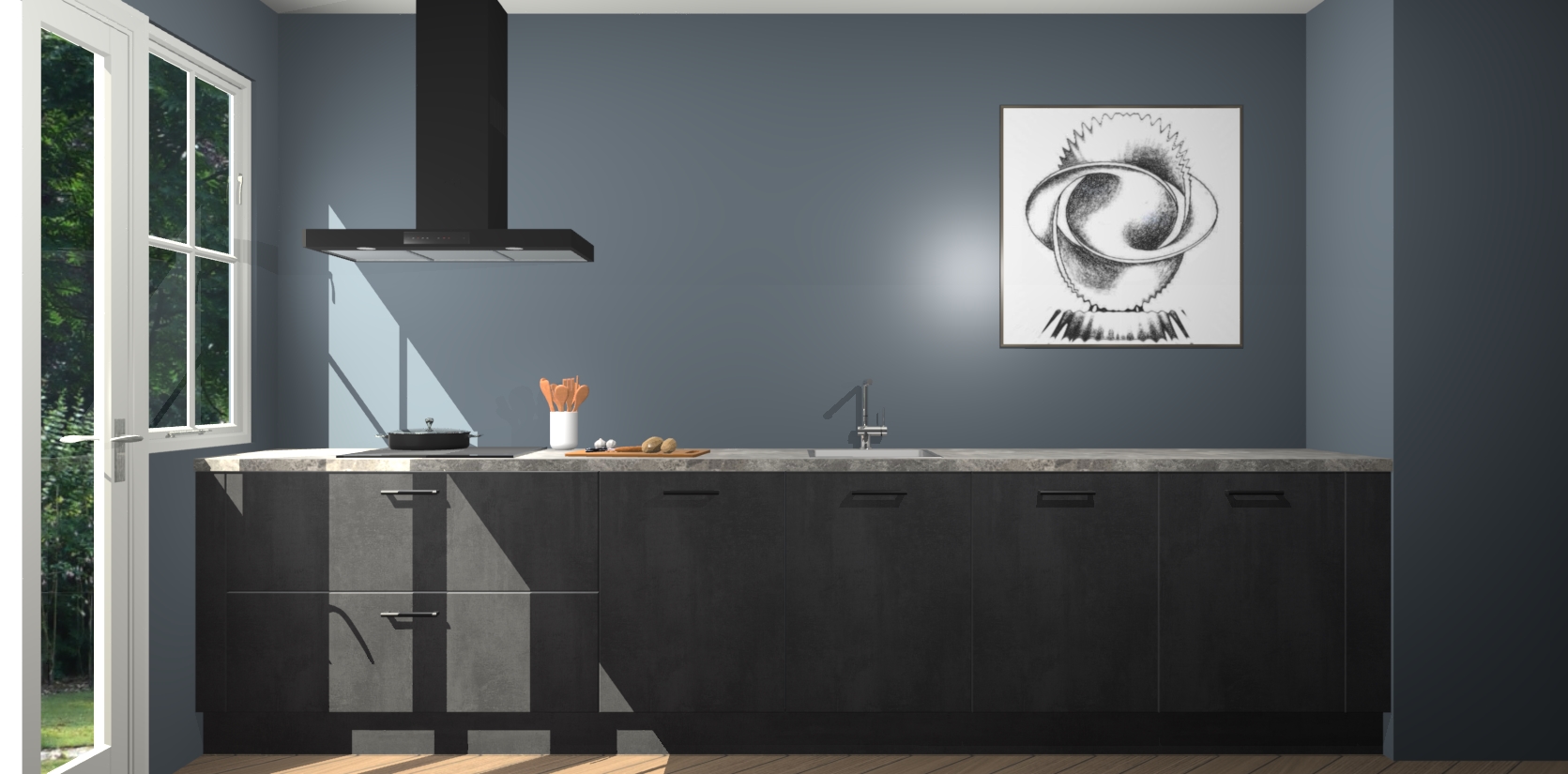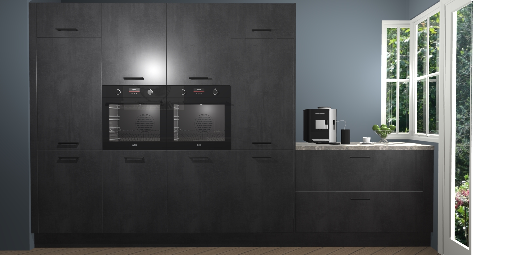 Een stijlvolle en praktische keuken als deze mag gezien worden. Dankzij de prachtige beton zwarte matte afwerking wordt de keuken gemakkelijk het middelpunt van uw huis - hij ziet er geweldig uit onder allerlei lichtomstandigheden, van dag tot nacht!