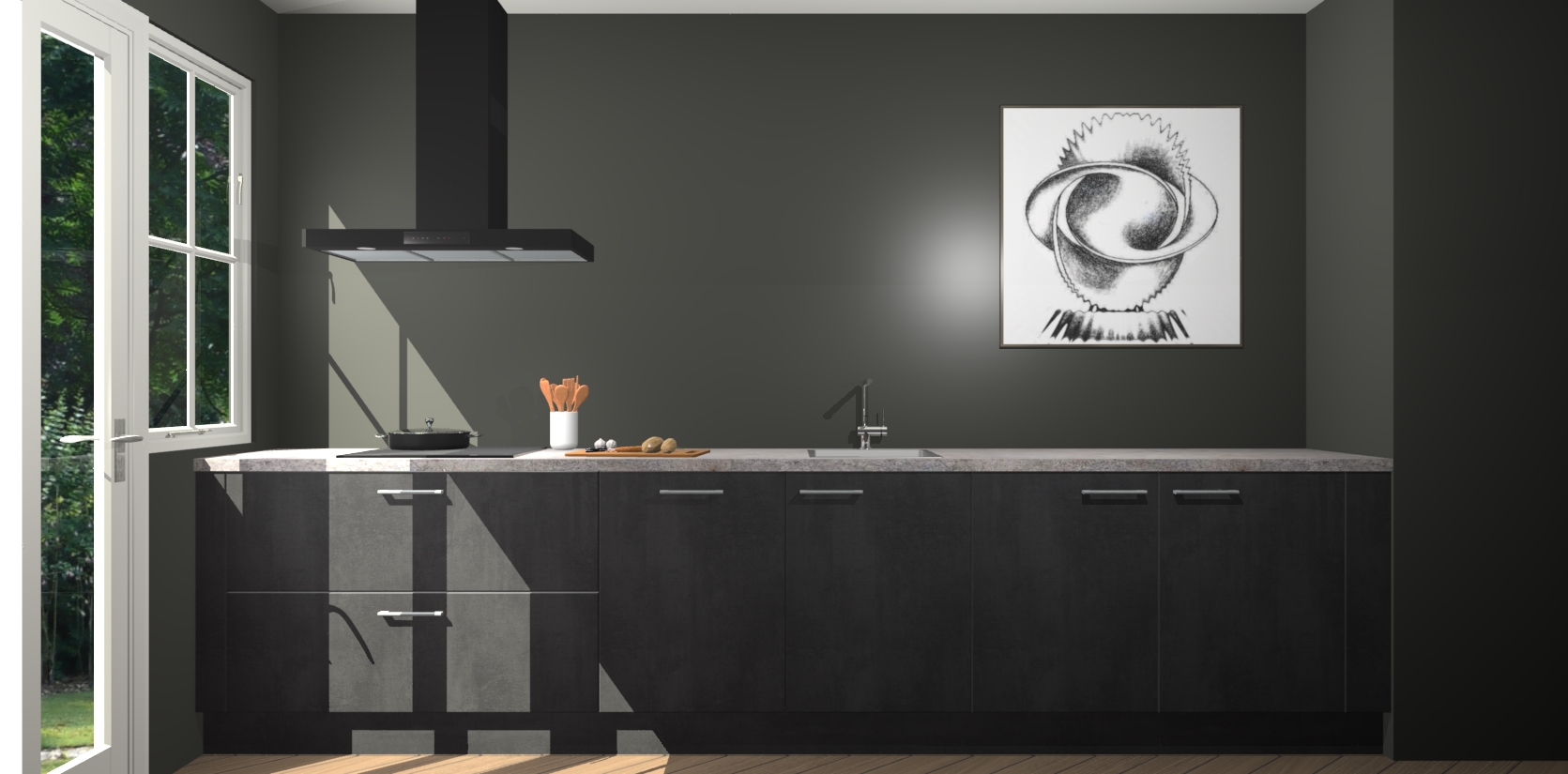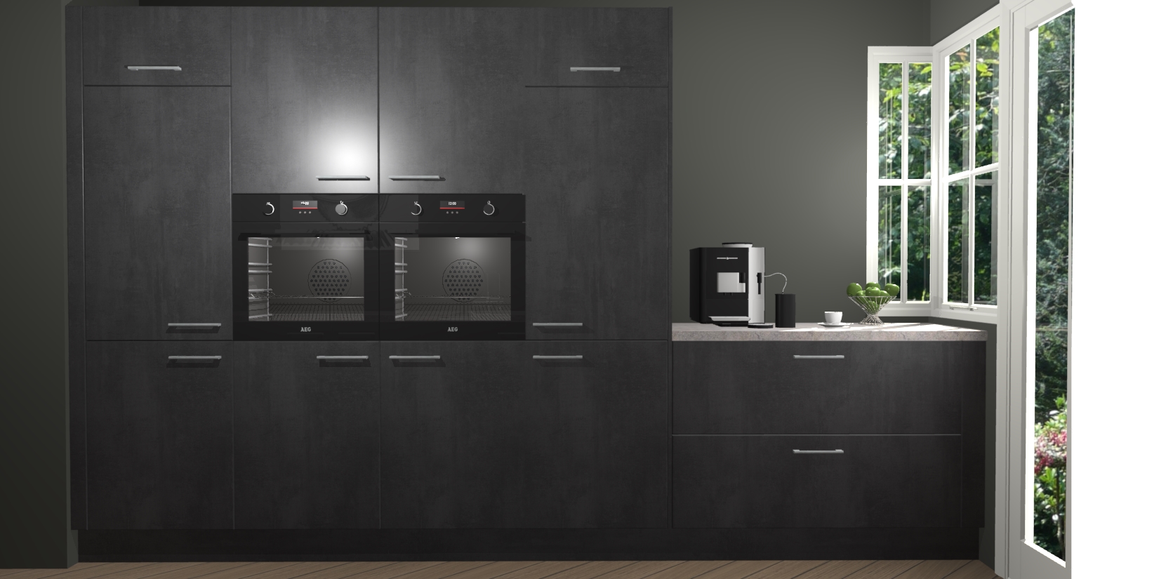 Een stijlvolle en praktische keuken als deze mag gezien worden. Dankzij de prachtige beton zwarte matte afwerking wordt de keuken gemakkelijk het middelpunt van uw huis - hij ziet er geweldig uit onder allerlei lichtomstandigheden, van dag tot nacht!