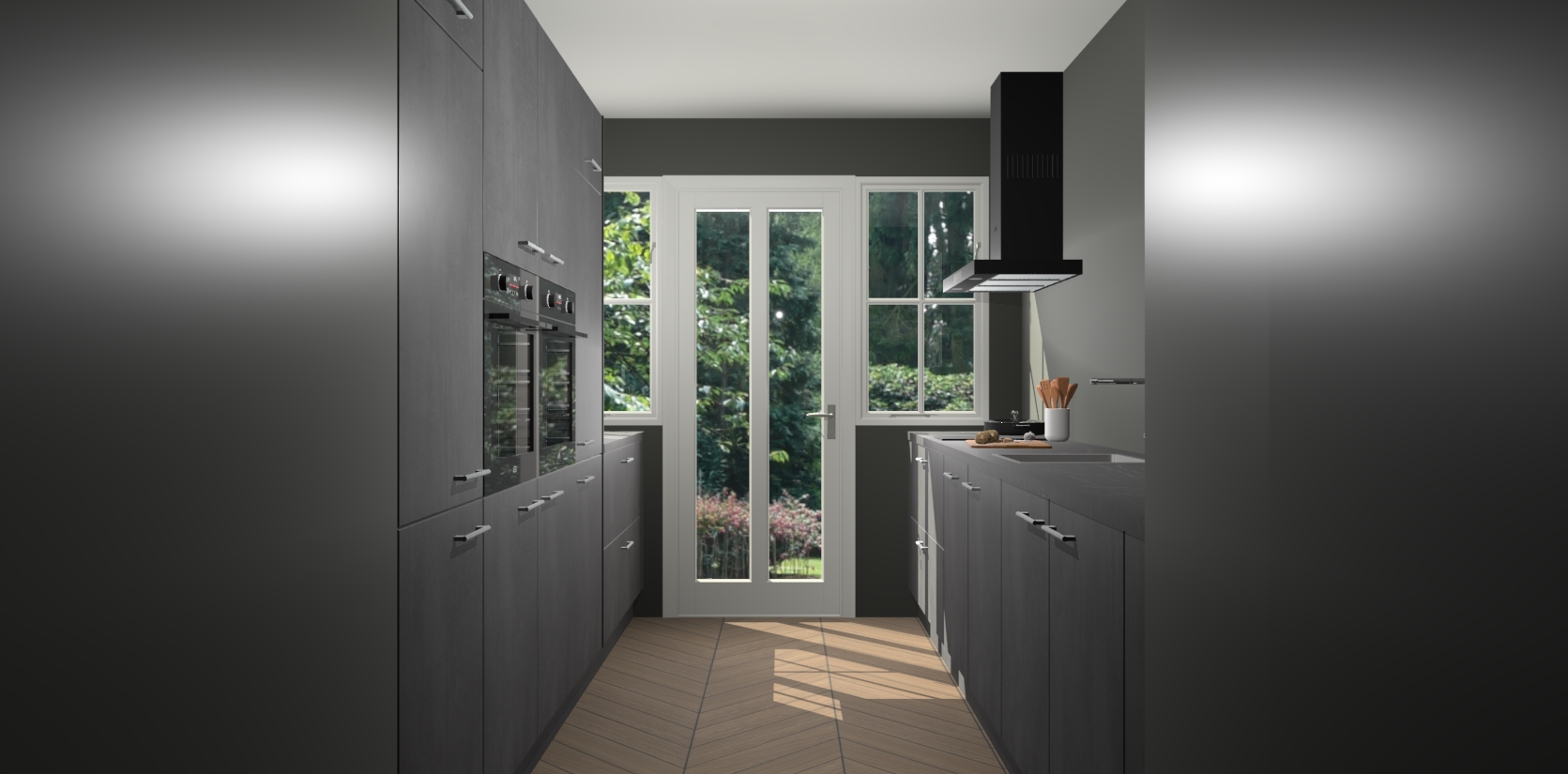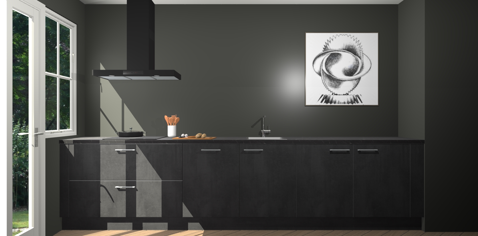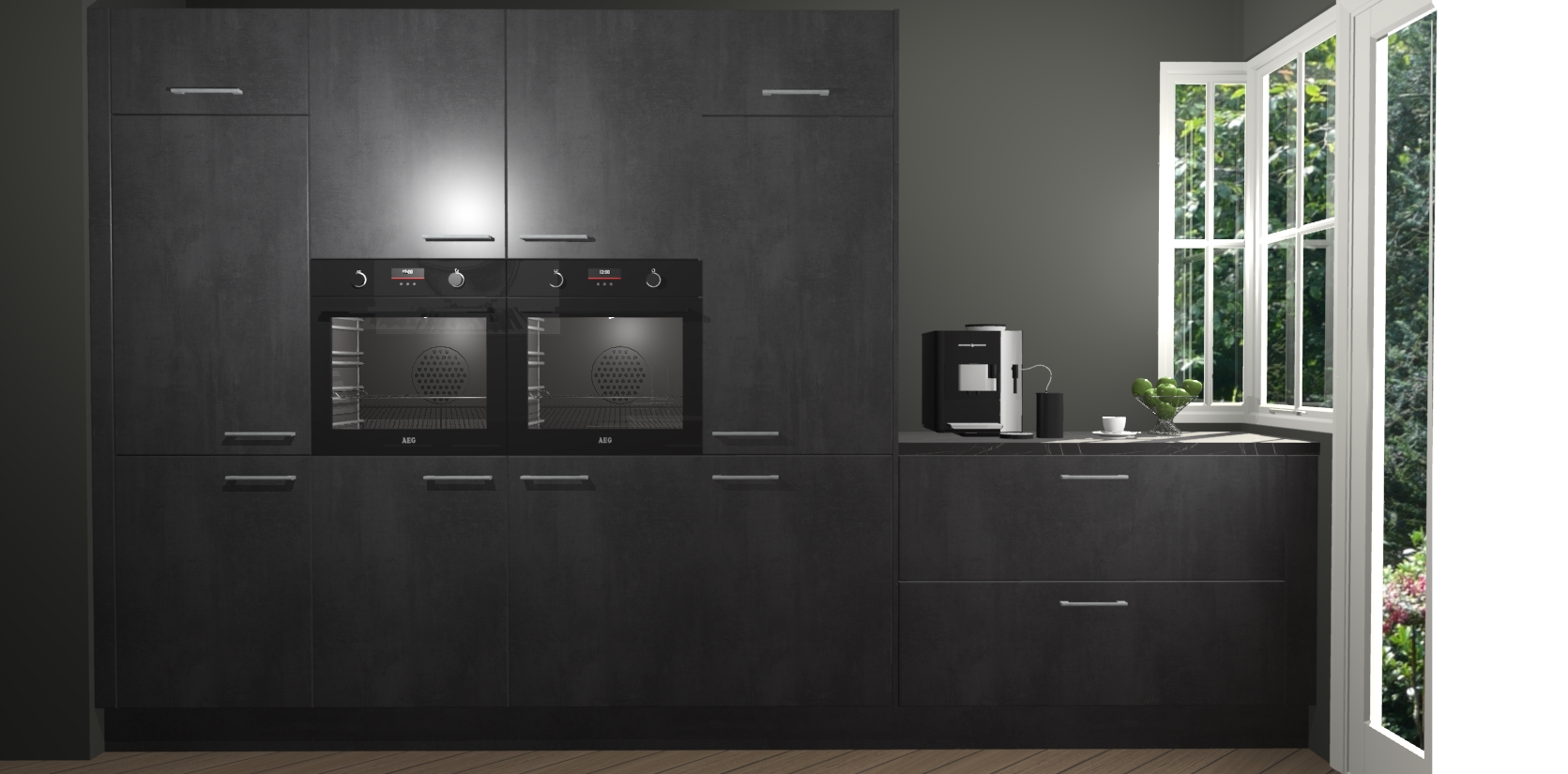 Een stijlvolle en praktische keuken als deze mag gezien worden. Dankzij de prachtige beton zwarte matte afwerking wordt de keuken gemakkelijk het middelpunt van uw huis - hij ziet er geweldig uit onder allerlei lichtomstandigheden, van dag tot nacht!