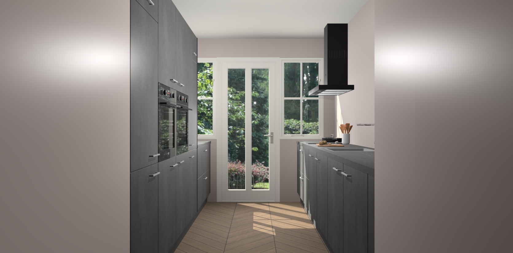 Een stijlvolle en praktische keuken als deze mag gezien worden. Dankzij de prachtige beton zwarte matte afwerking wordt de keuken gemakkelijk het middelpunt van uw huis - hij ziet er geweldig uit onder allerlei lichtomstandigheden, van dag tot nacht!
