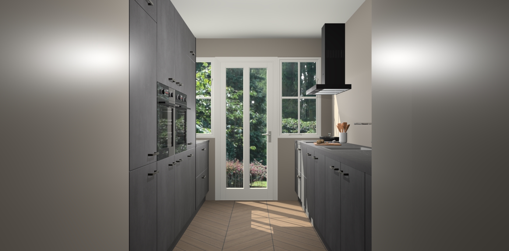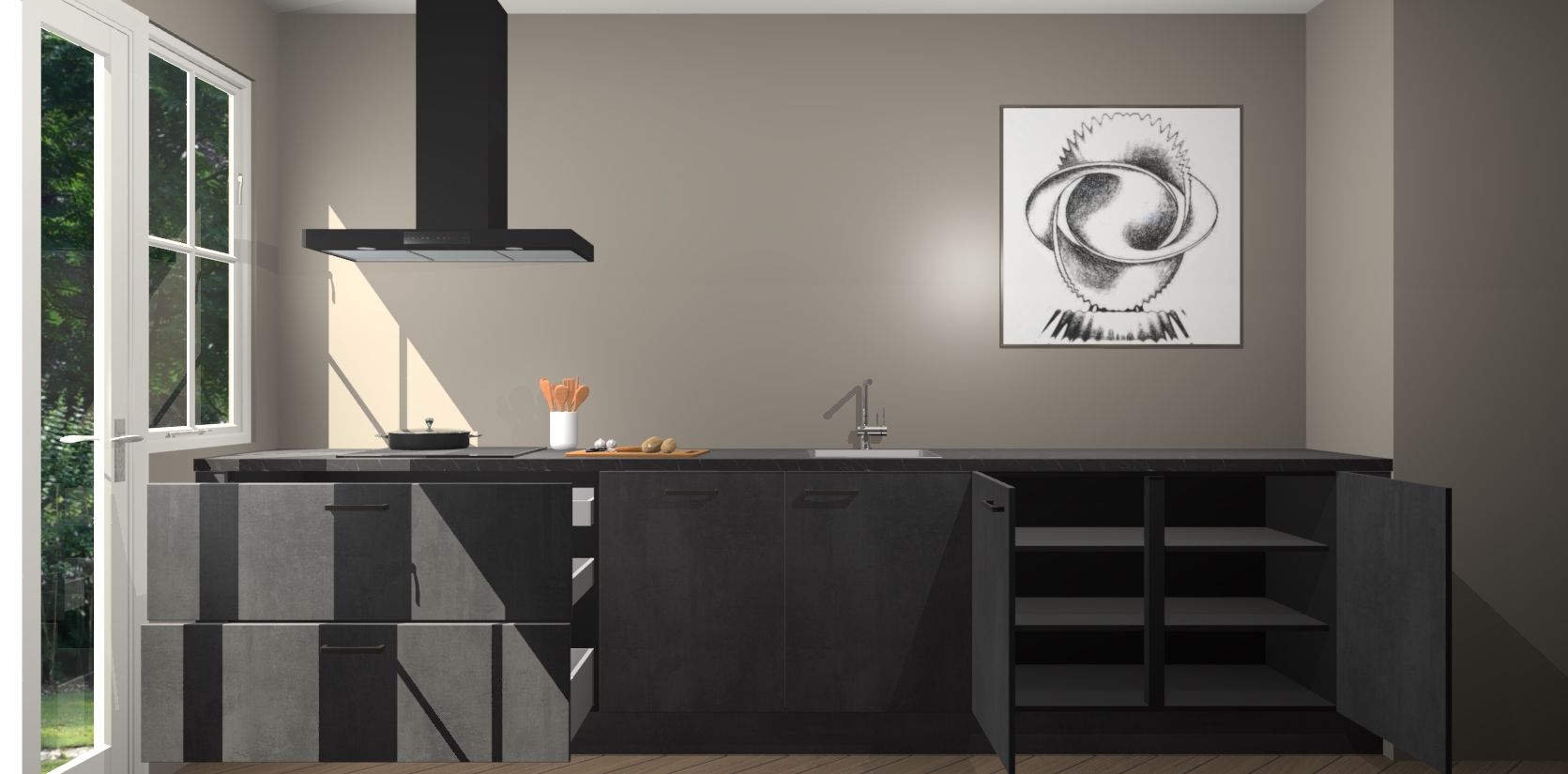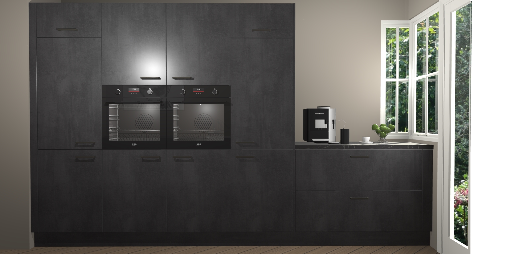 Een stijlvolle en praktische keuken als deze mag gezien worden. Dankzij de prachtige beton zwarte matte afwerking wordt de keuken gemakkelijk het middelpunt van uw huis - hij ziet er geweldig uit onder allerlei lichtomstandigheden, van dag tot nacht!