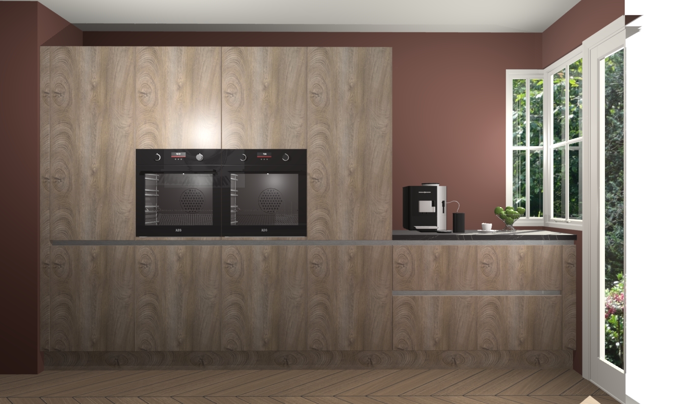 Een stijlvolle en praktische keuken als deze mag gezien worden. Dankzij de prachtige cantaro eiken matte afwerking wordt de keuken gemakkelijk het middelpunt van uw huis - hij ziet er geweldig uit onder allerlei lichtomstandigheden, van dag tot nacht!
