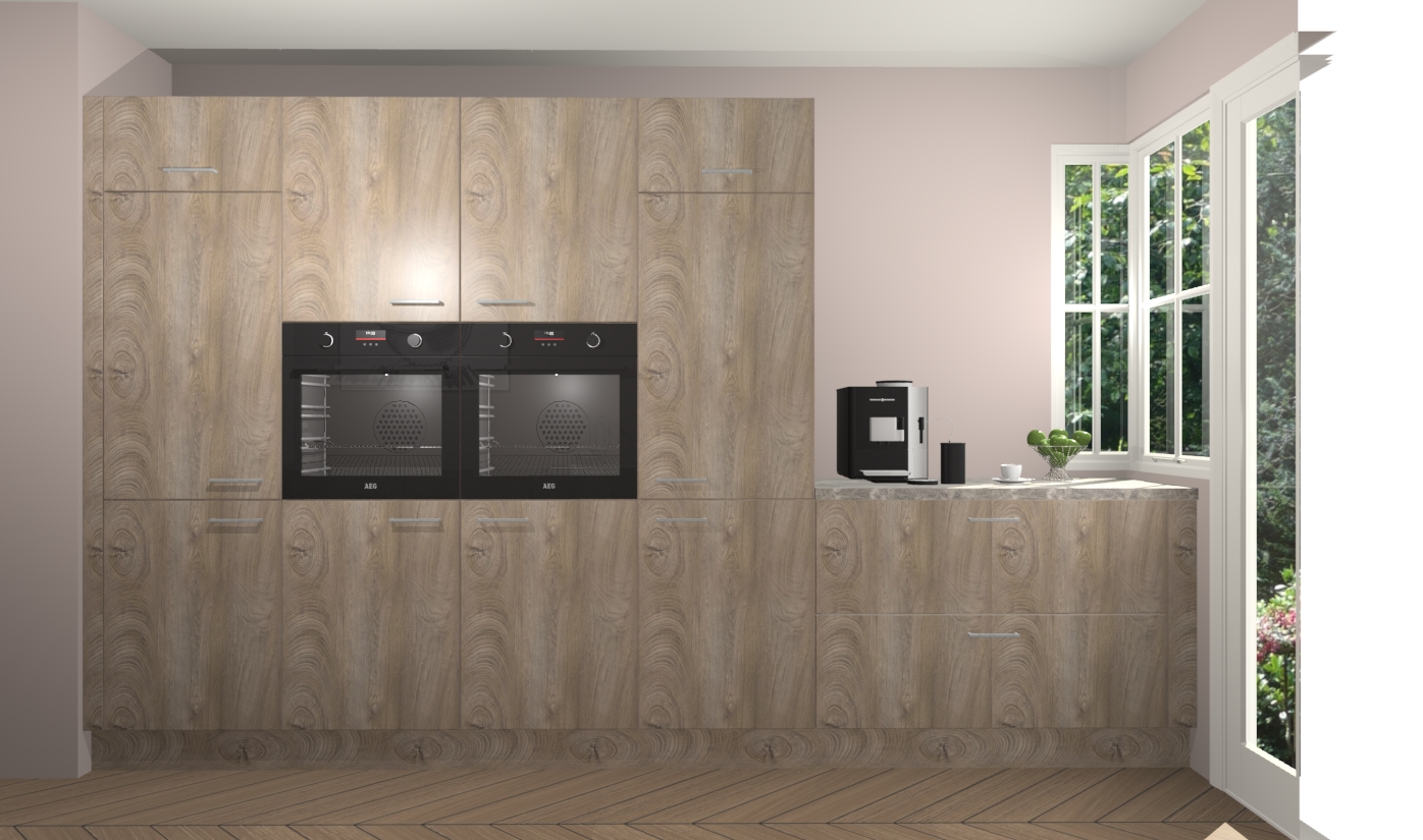 Een stijlvolle en praktische keuken als deze mag gezien worden. Dankzij de prachtige cantaro eiken matte afwerking wordt de keuken gemakkelijk het middelpunt van uw huis - hij ziet er geweldig uit onder allerlei lichtomstandigheden, van dag tot nacht!