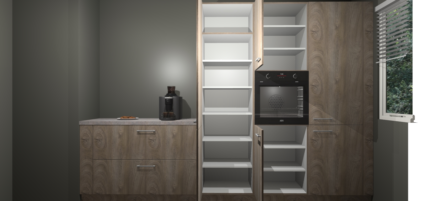 Een stijlvolle en praktische keuken als deze mag gezien worden. Dankzij de prachtige Cantaro Eiken matte afwerking wordt de keuken gemakkelijk het middelpunt van uw huis - hij ziet er geweldig uit onder allerlei lichtomstandigheden, van dag tot nacht!