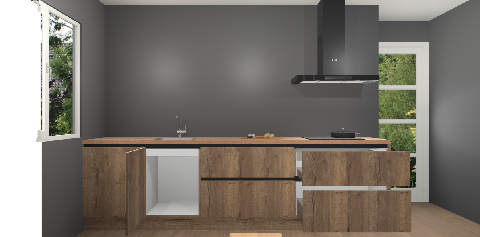 De softclose deuren openen en sluiten is ook heel eenvoudig - geniet van een moeiteloze keukenervaring, zelfs als er kinderen rondlopen. Voor extra gemak bij het plaatsen van uw bestelling bieden we ook een upgrade naar een kookplaat met geïntegreerde afzuiging.