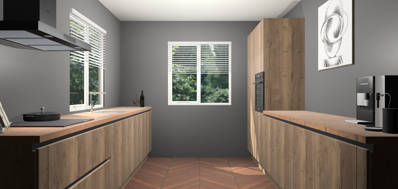 Welkom bij de Chocolade Eiken greeploze keuken Lusaka. Deze prachtige keuken zal de komende jaren het middelpunt van de belangstelling in uw huis zijn. Uitgerust met vijf inbouwapparaten komt u nooit kookgereedschap tekort. Bovendien geeft de warme houtlook elke ruimte een uitnodigende en tijdloze uitstraling.