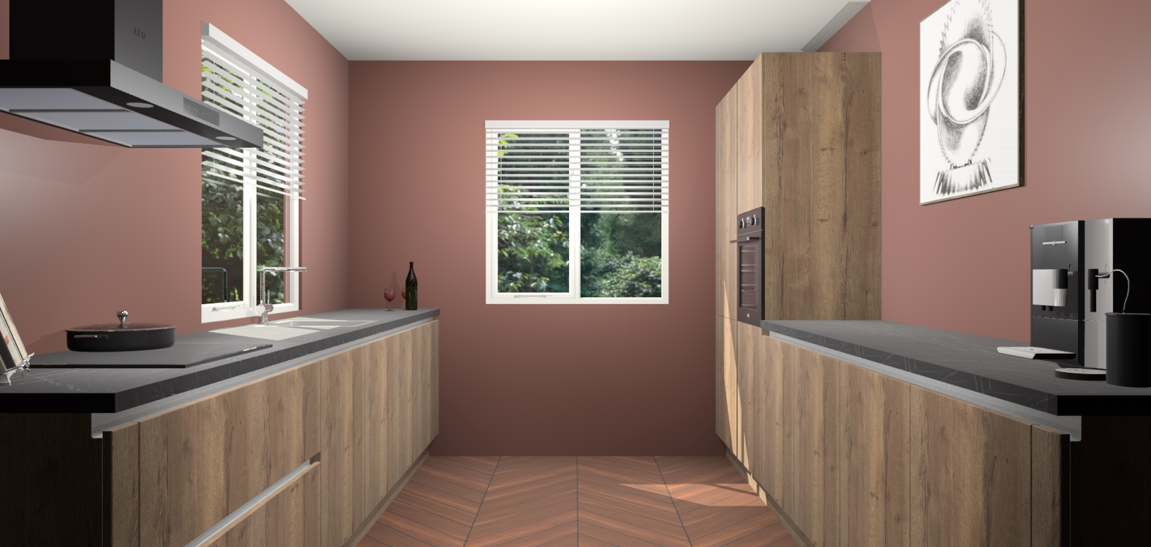 Welkom bij de Chocolade Eiken greeploze keuken Lusaka. Deze prachtige keuken zal de komende jaren het middelpunt van de belangstelling in uw huis zijn. Uitgerust met vijf inbouwapparaten komt u nooit kookgereedschap tekort. Bovendien geeft de warme houtlook elke ruimte een uitnodigende en tijdloze uitstraling.