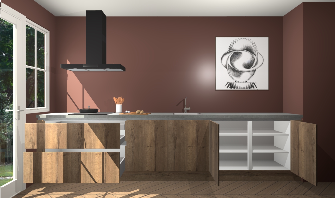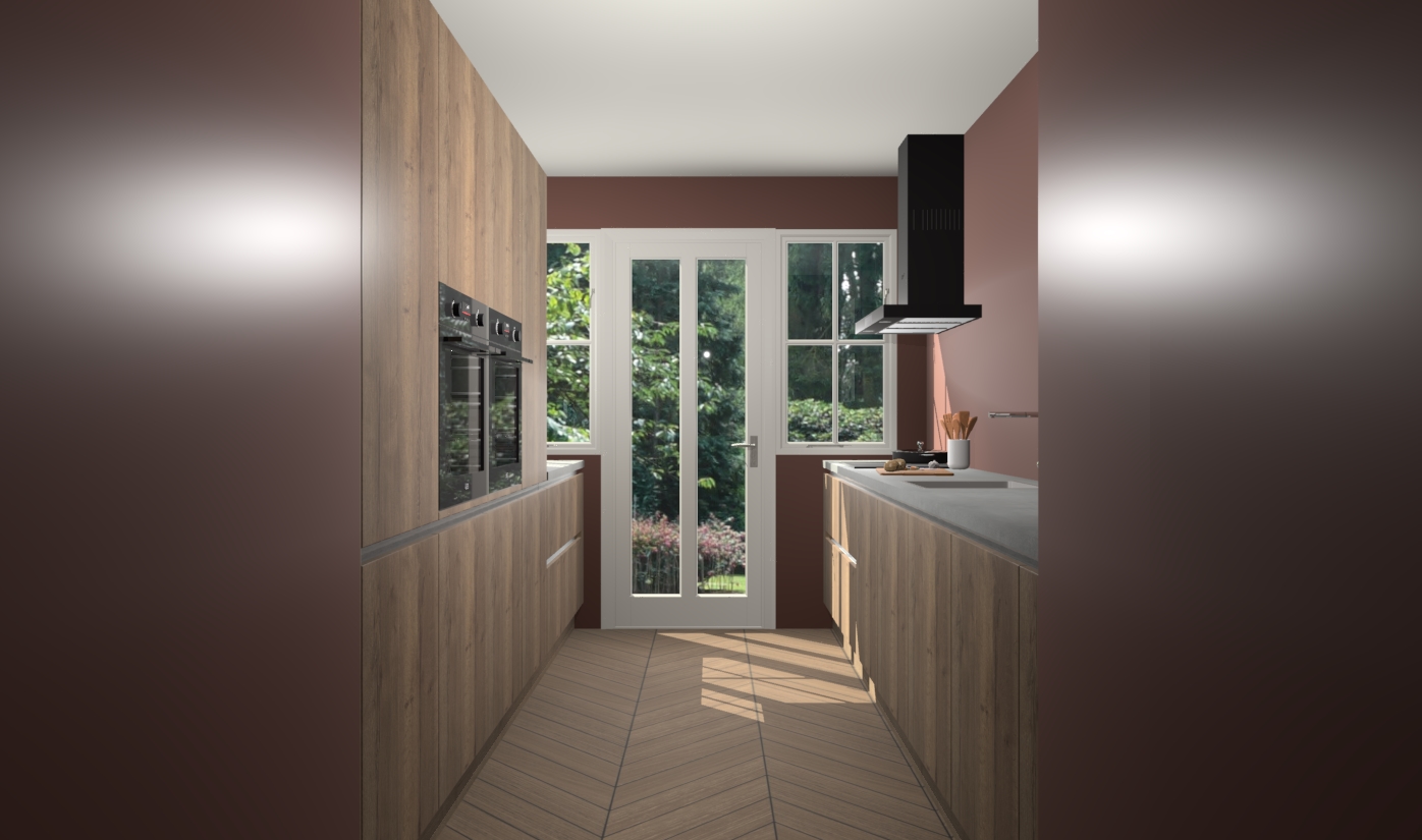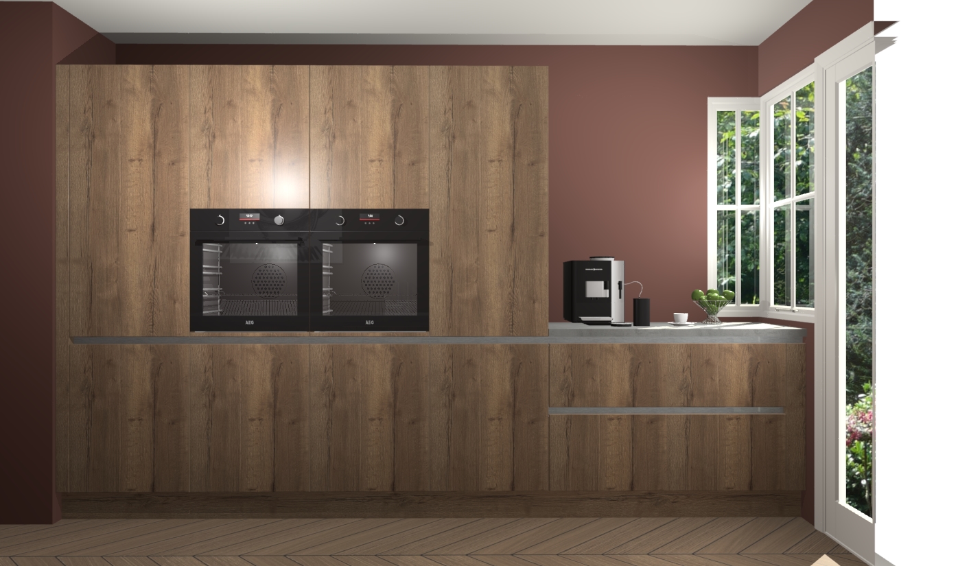 Een stijlvolle en praktische keuken als deze mag gezien worden. Dankzij de prachtige chocolade eiken matte afwerking wordt de keuken gemakkelijk het middelpunt van uw huis - hij ziet er geweldig uit onder allerlei lichtomstandigheden, van dag tot nacht!