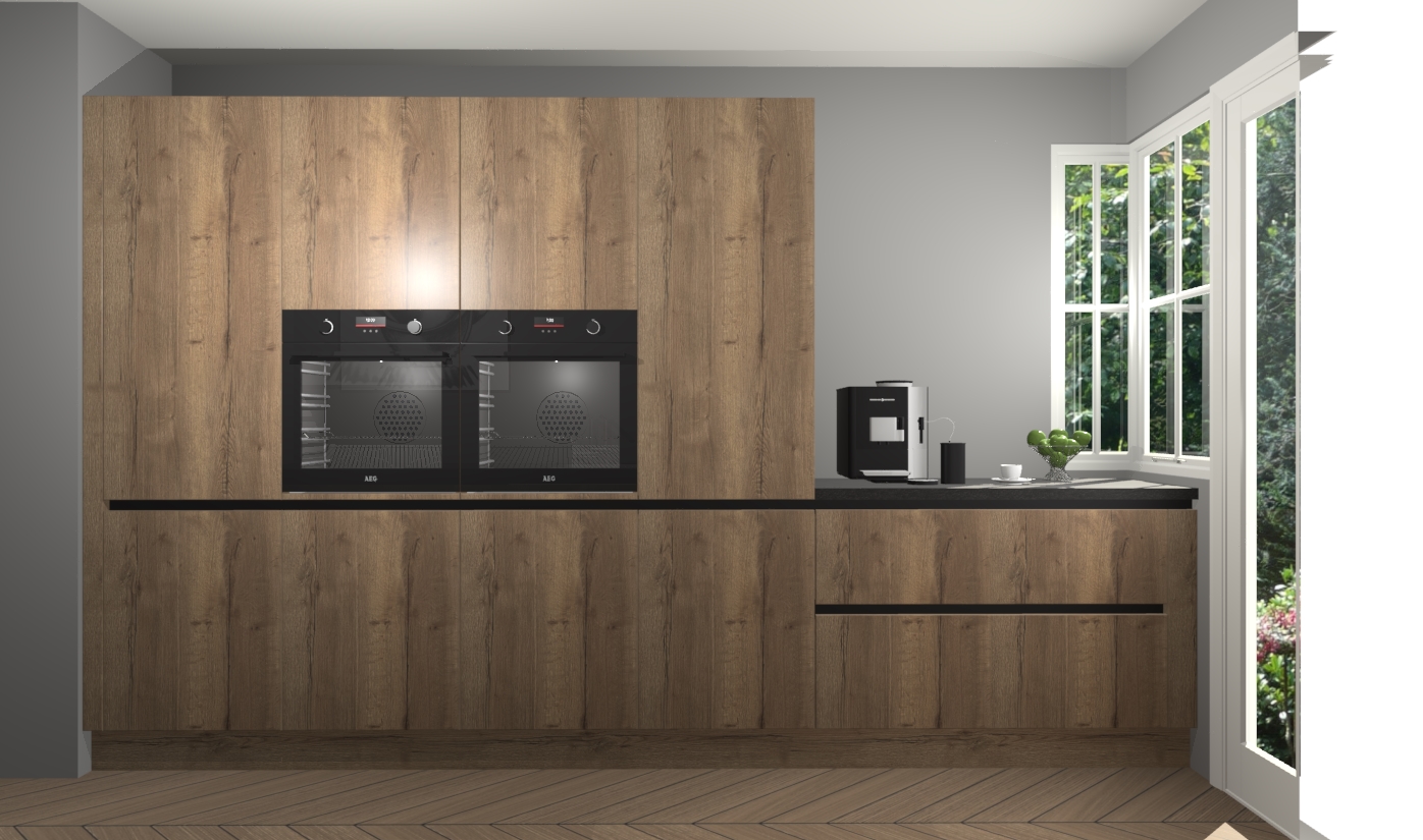 Een stijlvolle en praktische keuken als deze mag gezien worden. Dankzij de prachtige chocolade eiken matte afwerking wordt de keuken gemakkelijk het middelpunt van uw huis - hij ziet er geweldig uit onder allerlei lichtomstandigheden, van dag tot nacht!