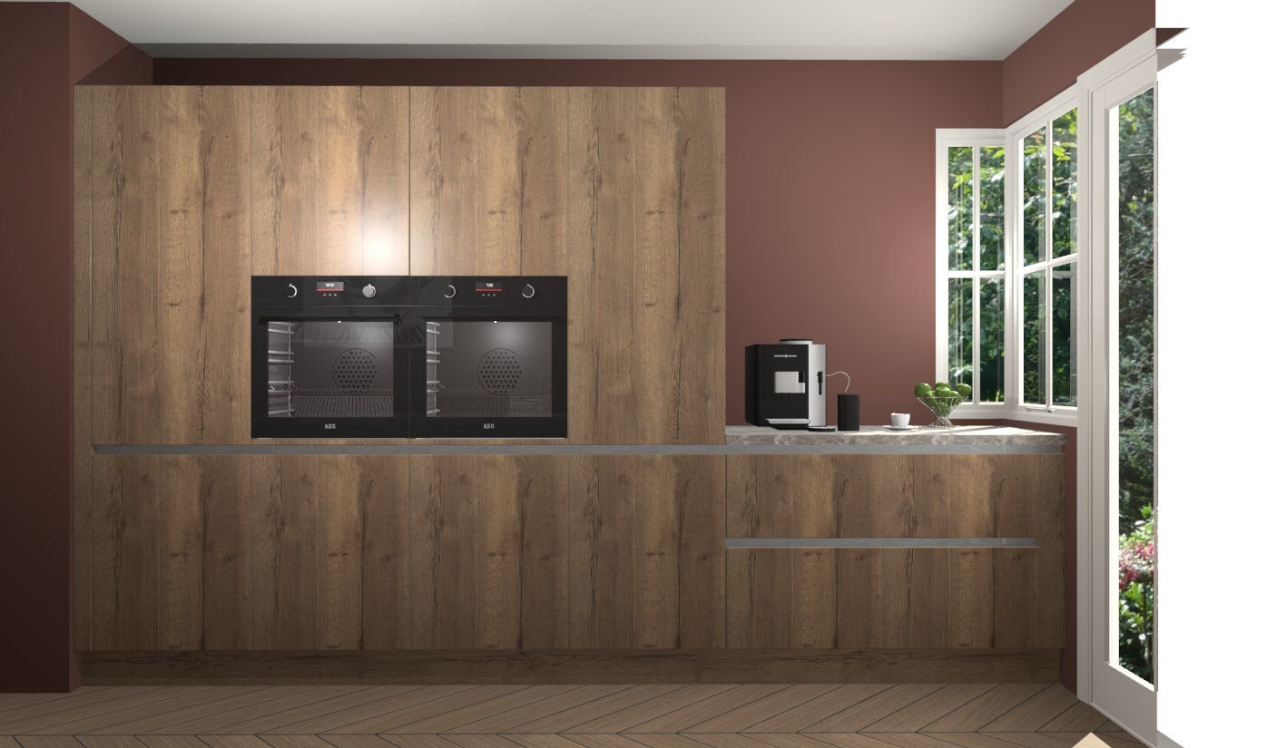 Een stijlvolle en praktische keuken als deze mag gezien worden. Dankzij de prachtige chocolade eiken matte afwerking wordt de keuken gemakkelijk het middelpunt van uw huis - hij ziet er geweldig uit onder allerlei lichtomstandigheden, van dag tot nacht!