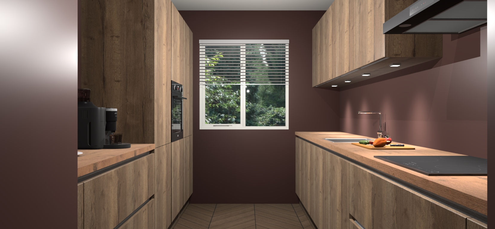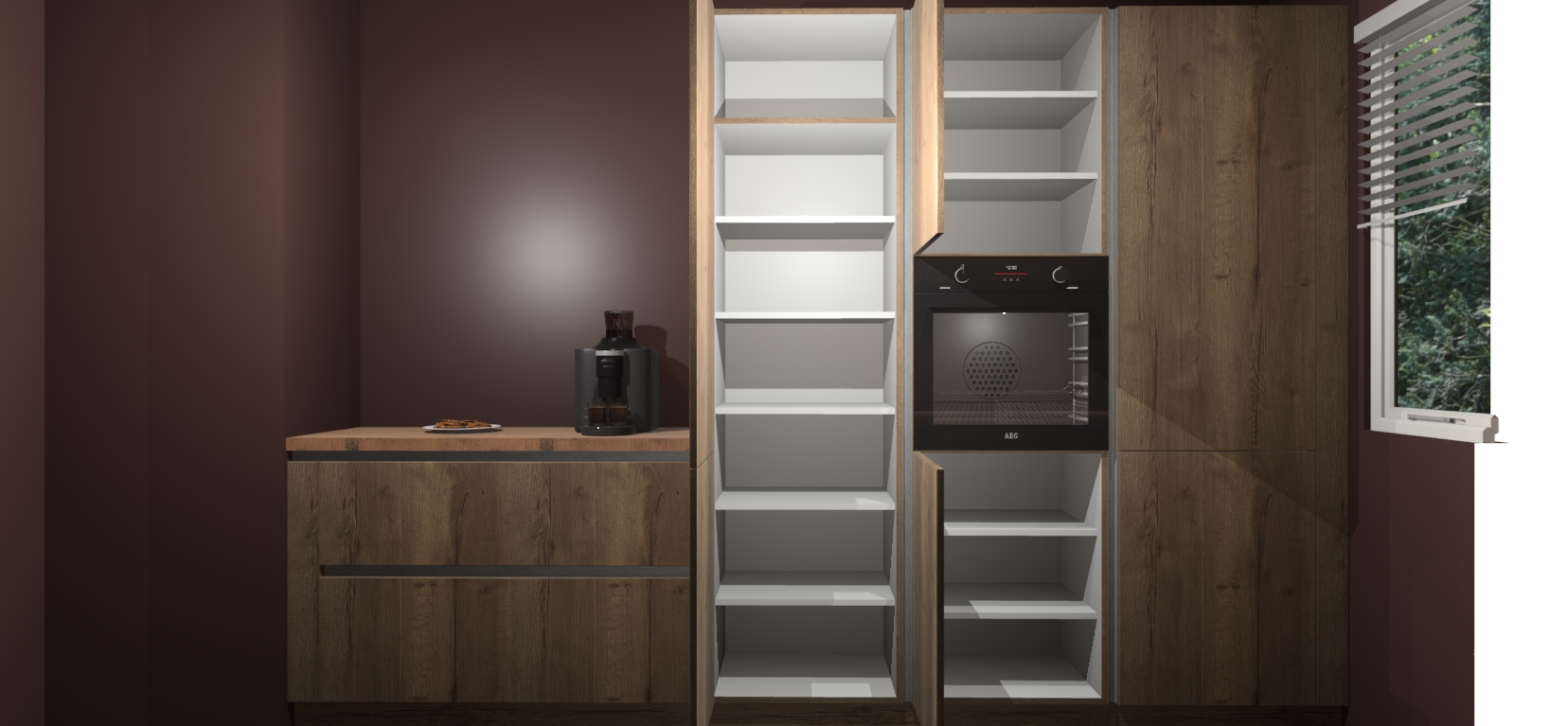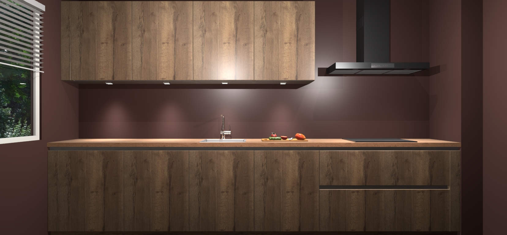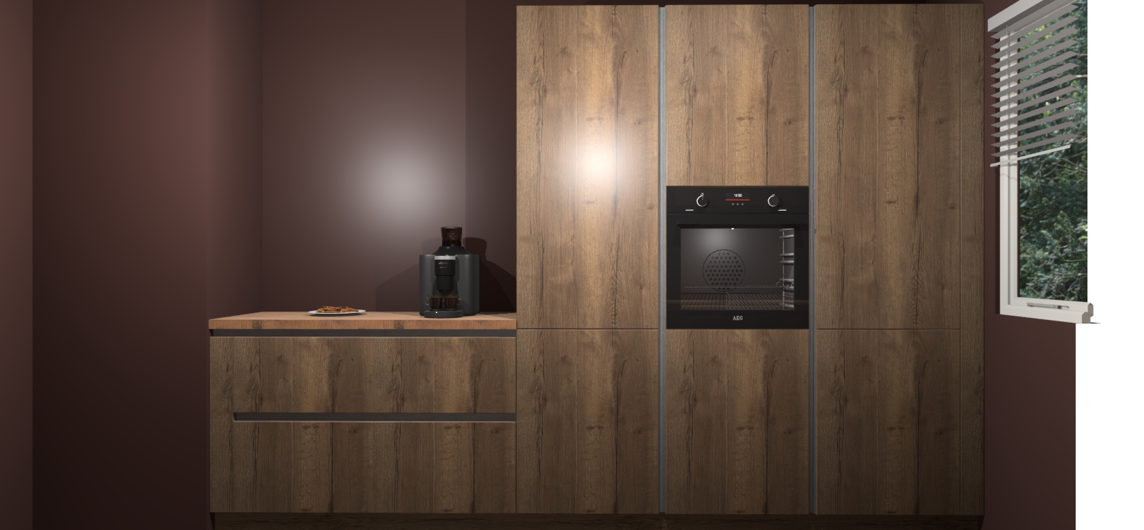 Een stijlvolle en praktische keuken als deze mag gezien worden. Dankzij de prachtige Chocolade Eiken matte afwerking wordt de keuken gemakkelijk het middelpunt van uw huis - hij ziet er geweldig uit onder allerlei lichtomstandigheden, van dag tot nacht!