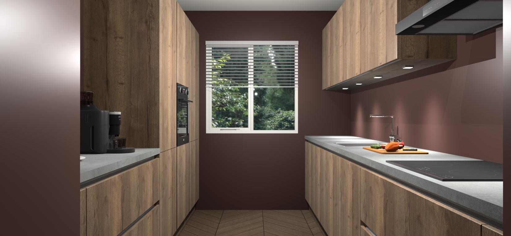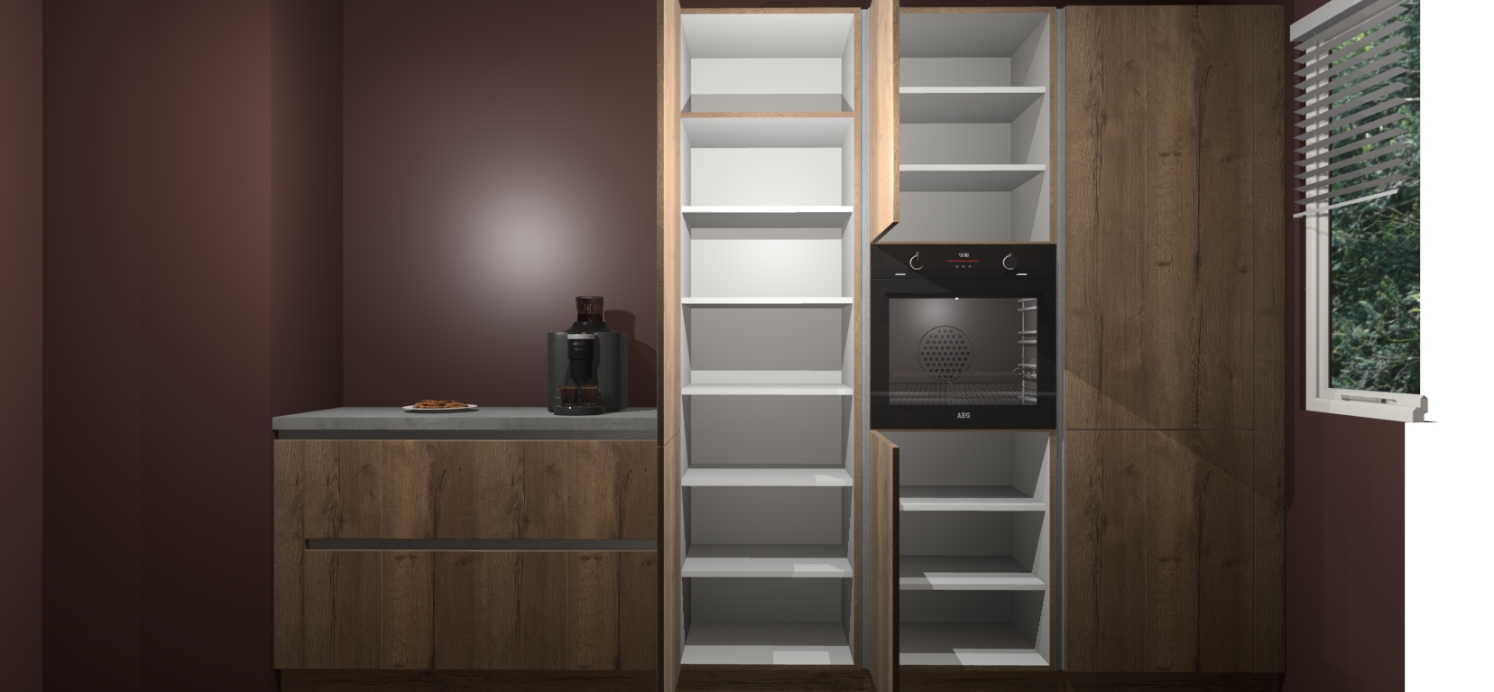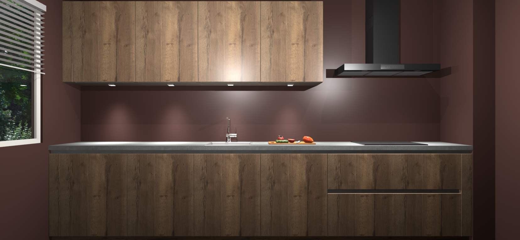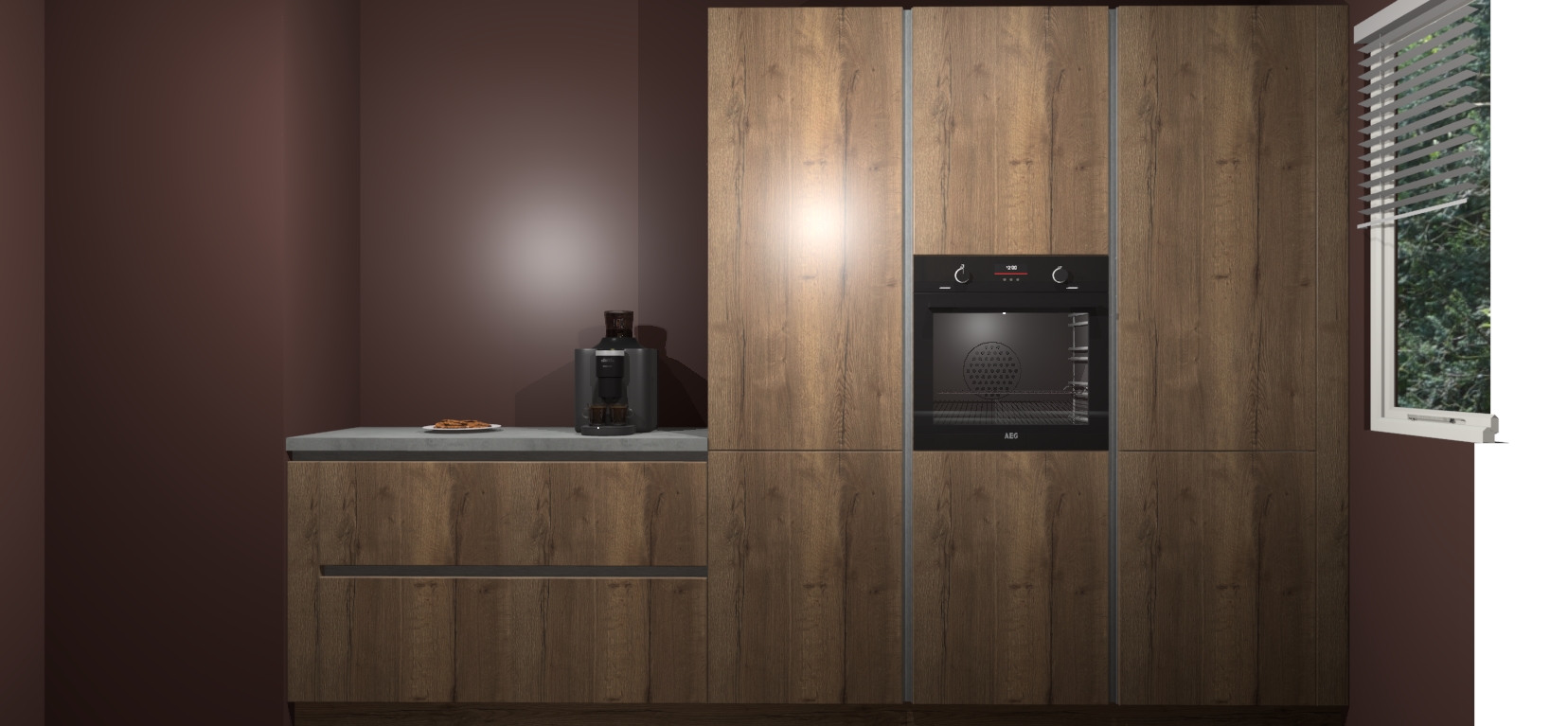 Een stijlvolle en praktische keuken als deze mag gezien worden. Dankzij de prachtige Chocolade Eiken matte afwerking wordt de keuken gemakkelijk het middelpunt van uw huis - hij ziet er geweldig uit onder allerlei lichtomstandigheden, van dag tot nacht!