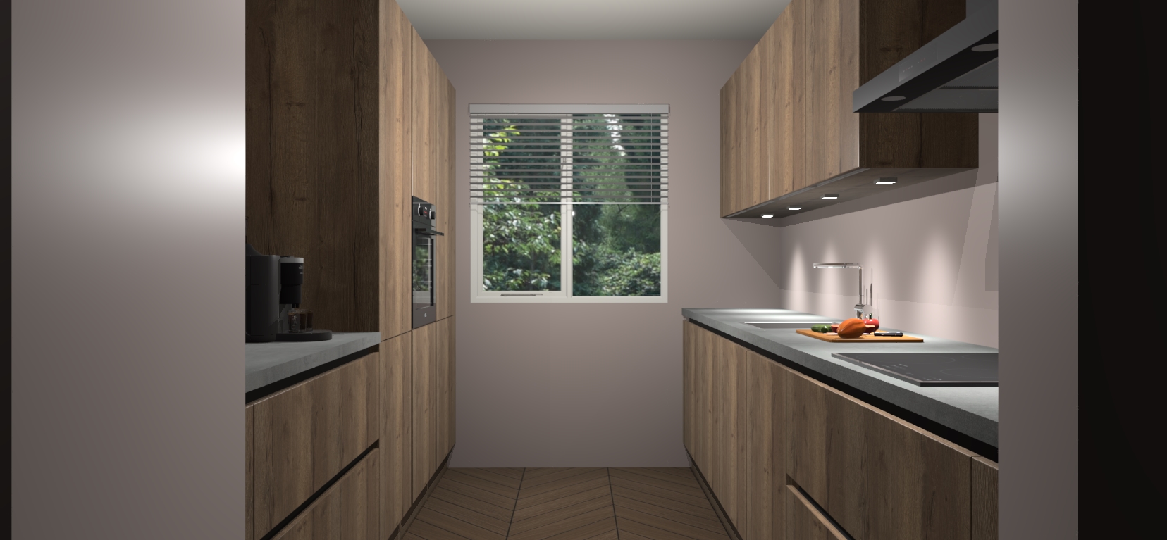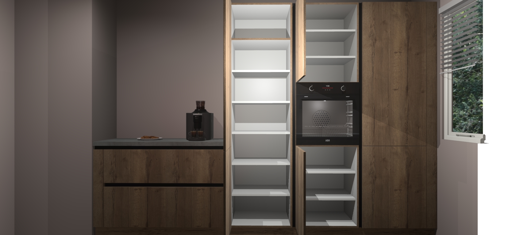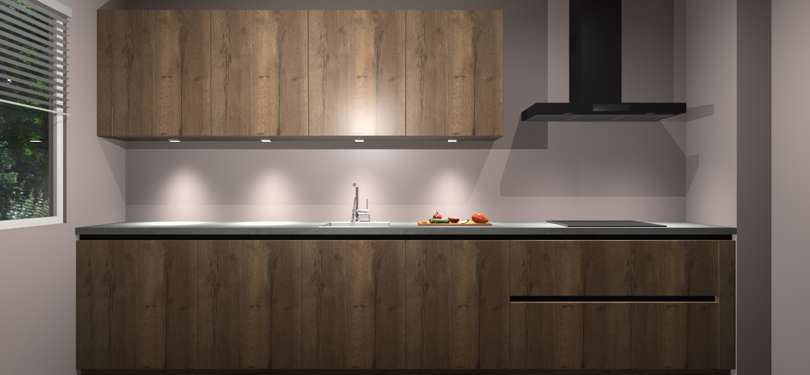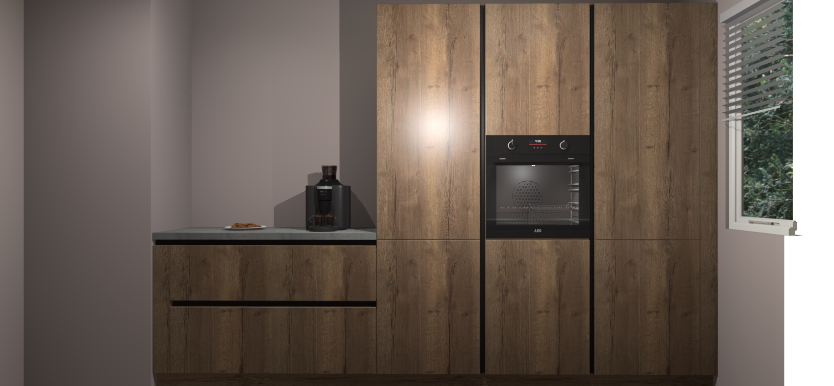 Een stijlvolle en praktische keuken als deze mag gezien worden. Dankzij de prachtige Chocolade Eiken matte afwerking wordt de keuken gemakkelijk het middelpunt van uw huis - hij ziet er geweldig uit onder allerlei lichtomstandigheden, van dag tot nacht!