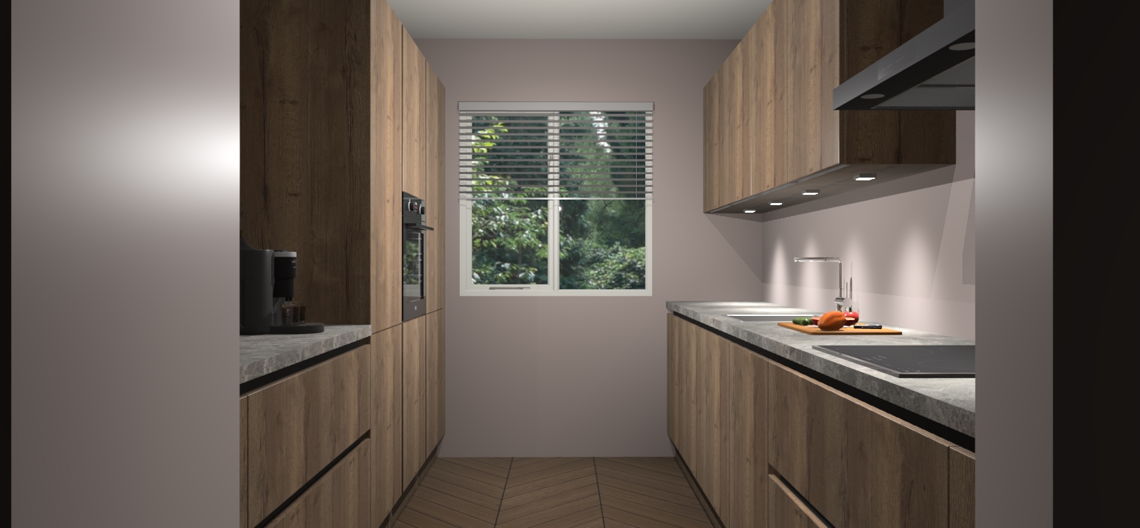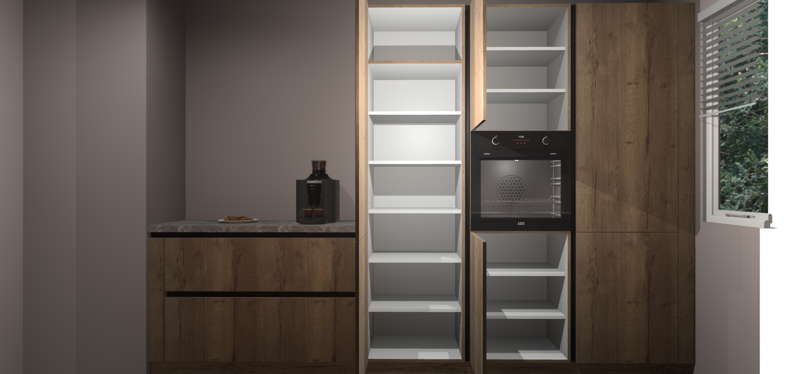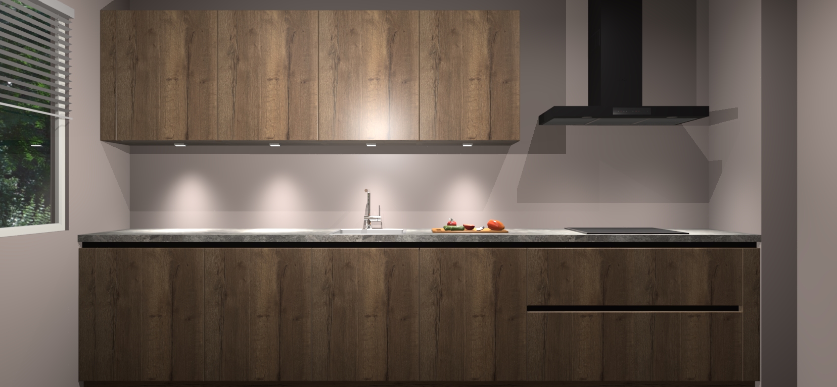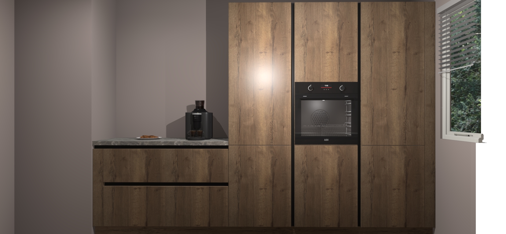 Een stijlvolle en praktische keuken als deze mag gezien worden. Dankzij de prachtige Chocolade Eiken matte afwerking wordt de keuken gemakkelijk het middelpunt van uw huis - hij ziet er geweldig uit onder allerlei lichtomstandigheden, van dag tot nacht!