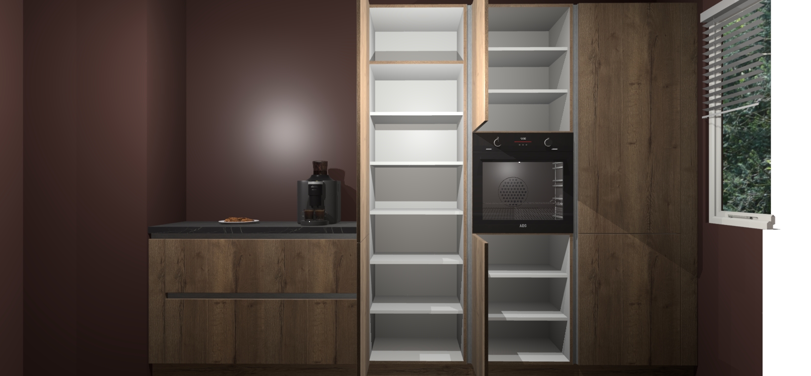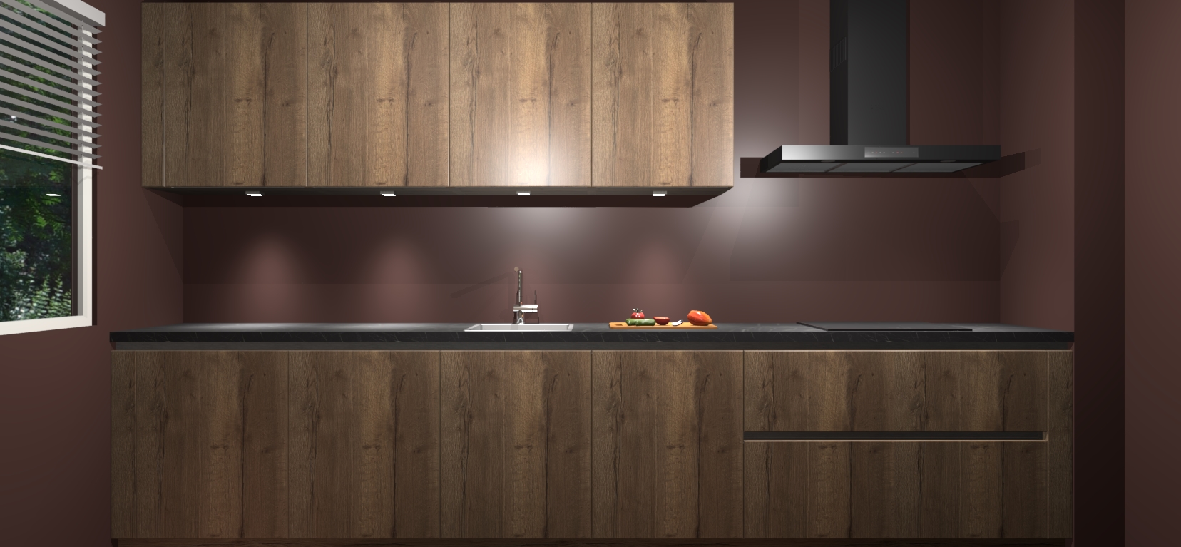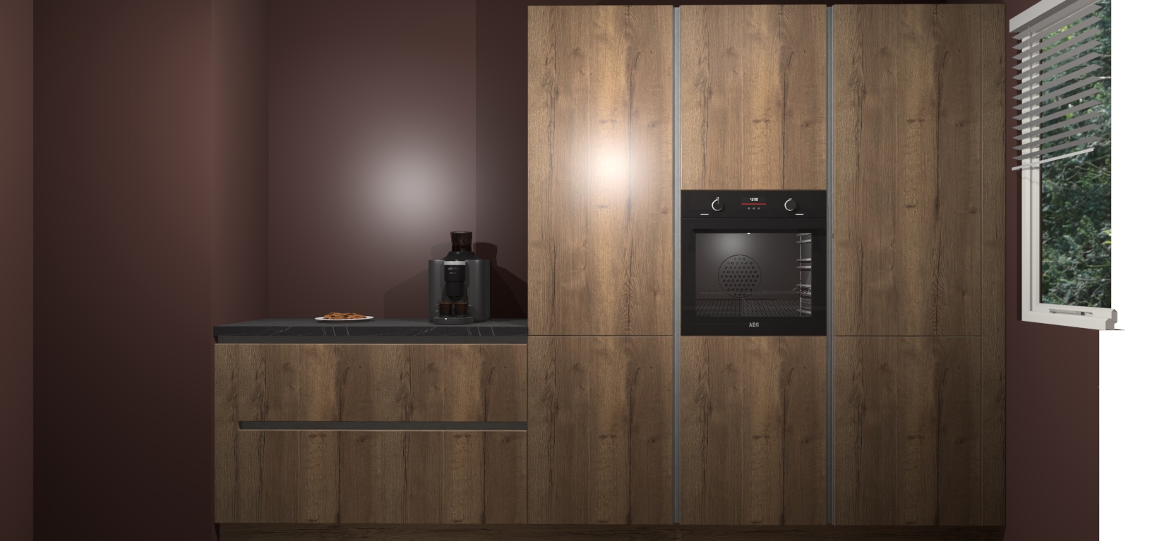 Een stijlvolle en praktische keuken als deze mag gezien worden. Dankzij de prachtige Chocolade Eiken matte afwerking wordt de keuken gemakkelijk het middelpunt van uw huis - hij ziet er geweldig uit onder allerlei lichtomstandigheden, van dag tot nacht!