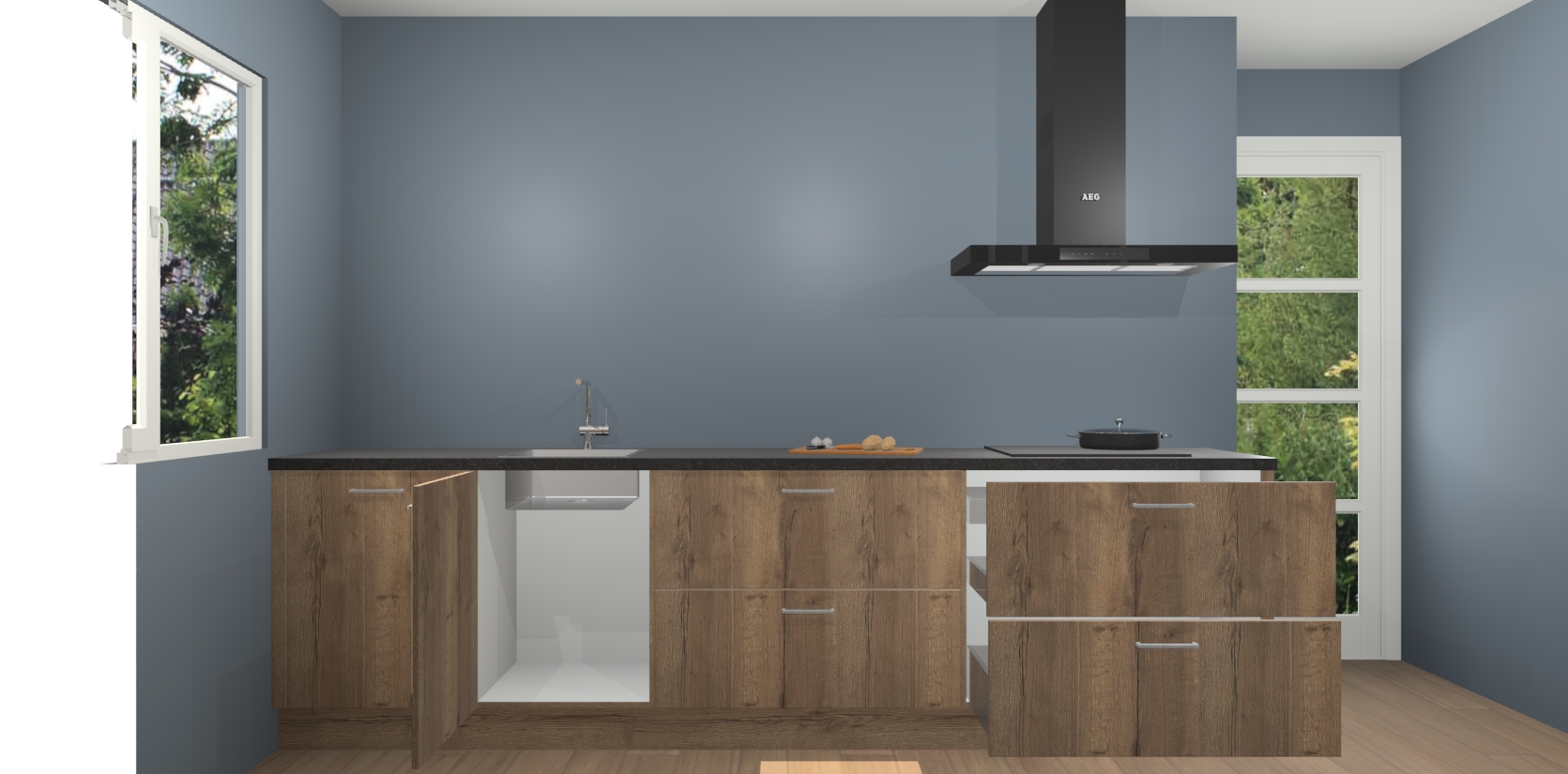 De softclose deuren openen en sluiten is ook heel eenvoudig - geniet van een moeiteloze keukenervaring, zelfs als er kinderen rondlopen. Voor extra gemak bij het plaatsen van uw bestelling bieden we ook een upgrade naar een kookplaat met geïntegreerde afzuiging.