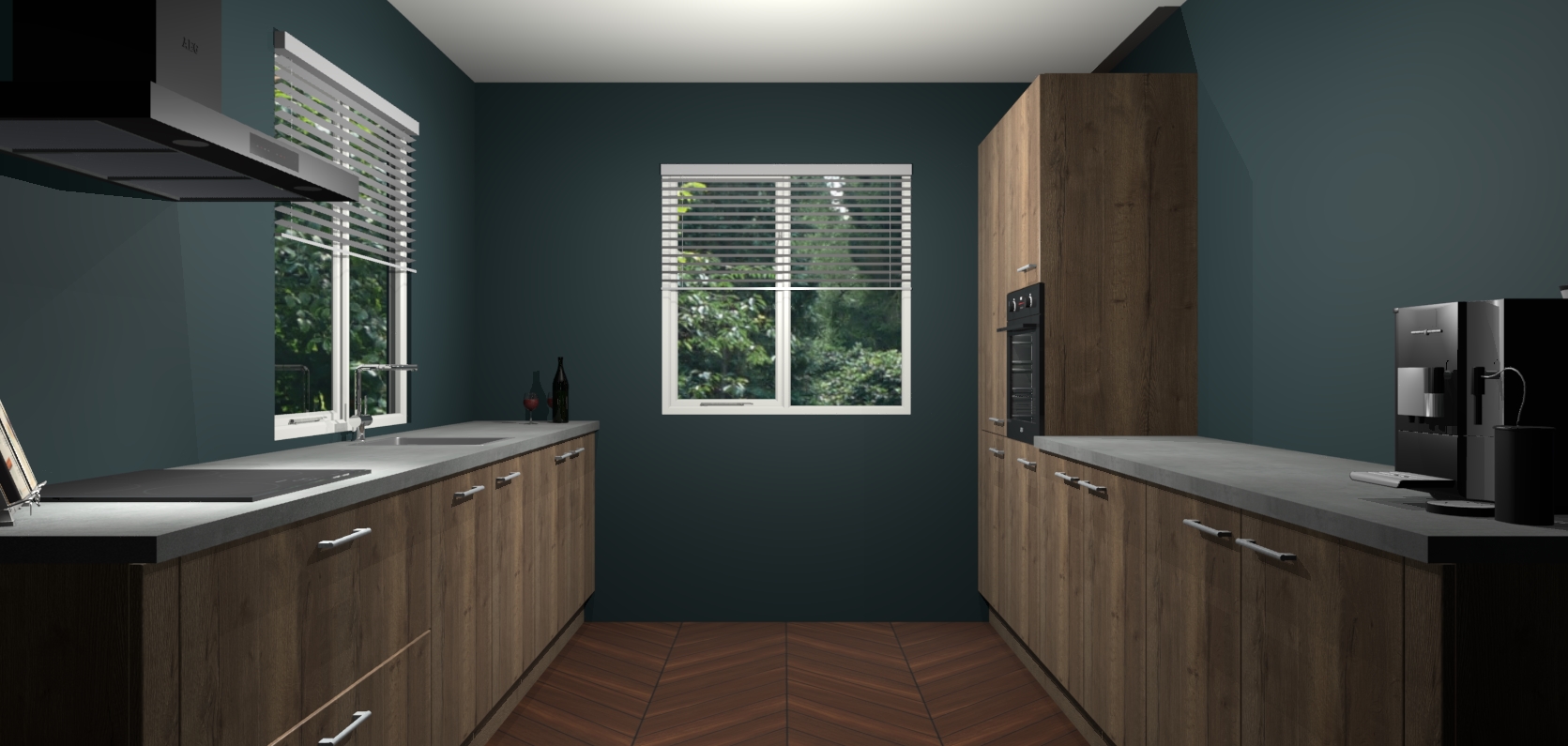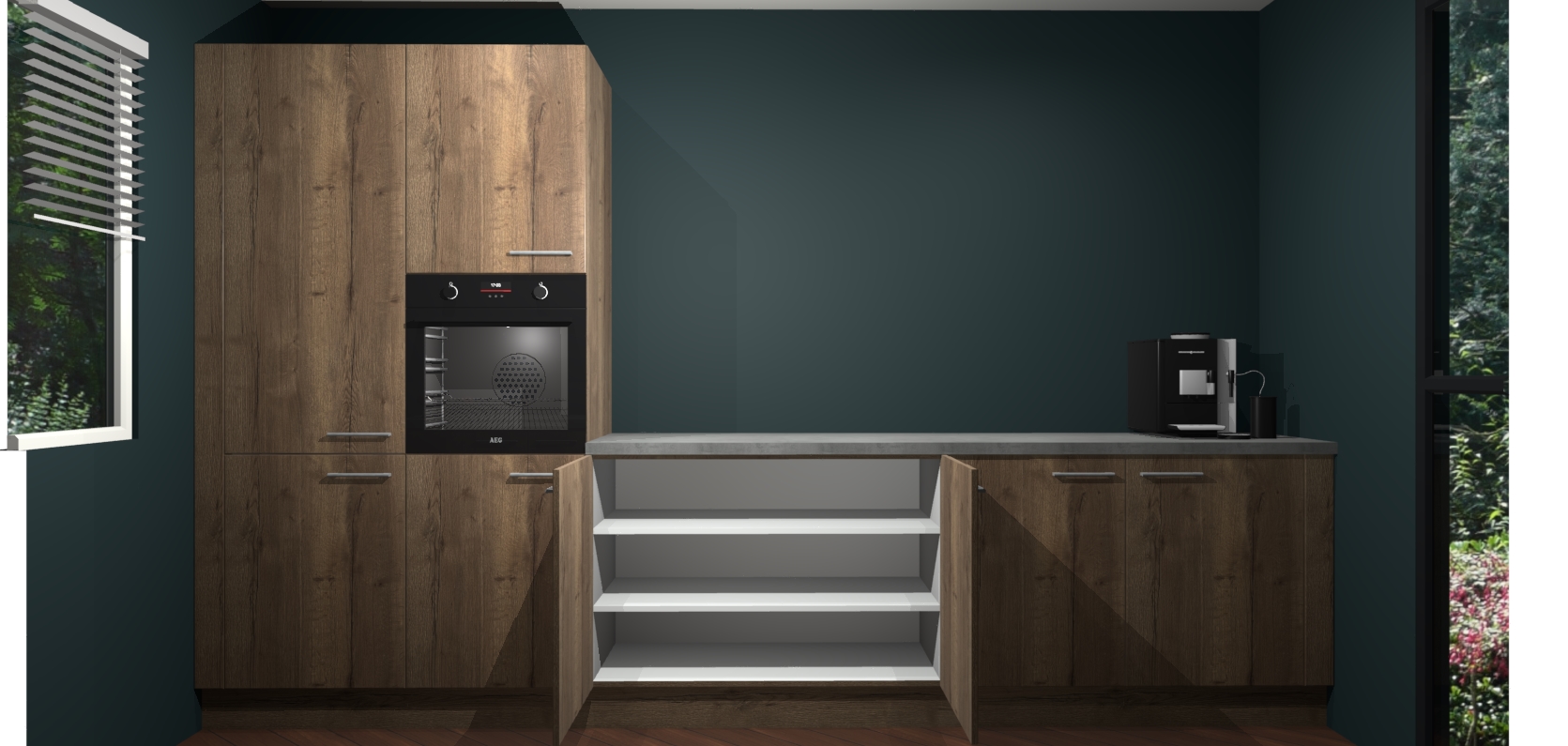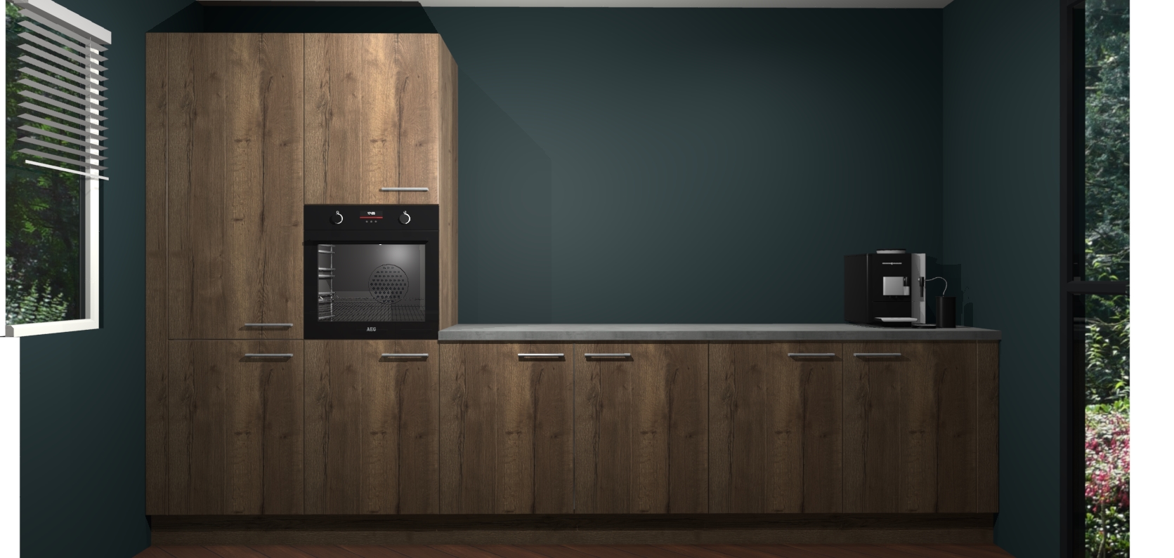 Welkom bij de Chocolade Eiken keuken Lusaka. Deze prachtige keuken zal de komende jaren het middelpunt van de belangstelling in uw huis zijn. Uitgerust met vijf inbouwapparaten komt u nooit kookgereedschap tekort. Bovendien geeft de warme houtlook elke ruimte een uitnodigende en tijdloze uitstraling.