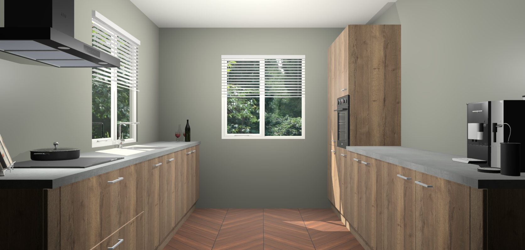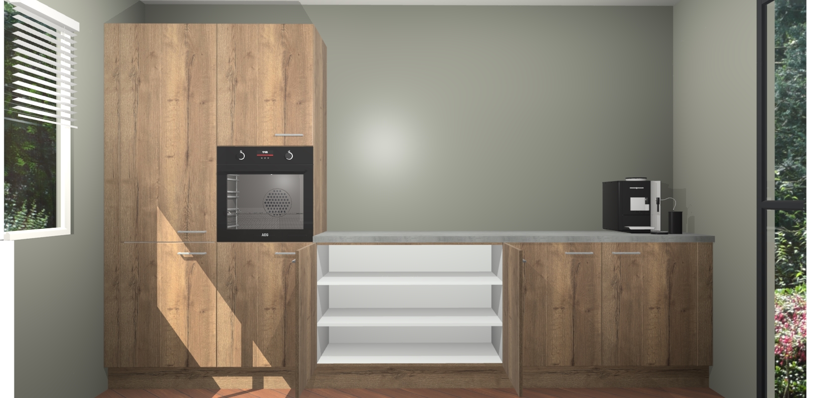 Welkom bij de Chocolade Eiken keuken Lusaka. Deze prachtige keuken zal de komende jaren het middelpunt van de belangstelling in uw huis zijn. Uitgerust met vijf inbouwapparaten komt u nooit kookgereedschap tekort. Bovendien geeft de warme houtlook elke ruimte een uitnodigende en tijdloze uitstraling.