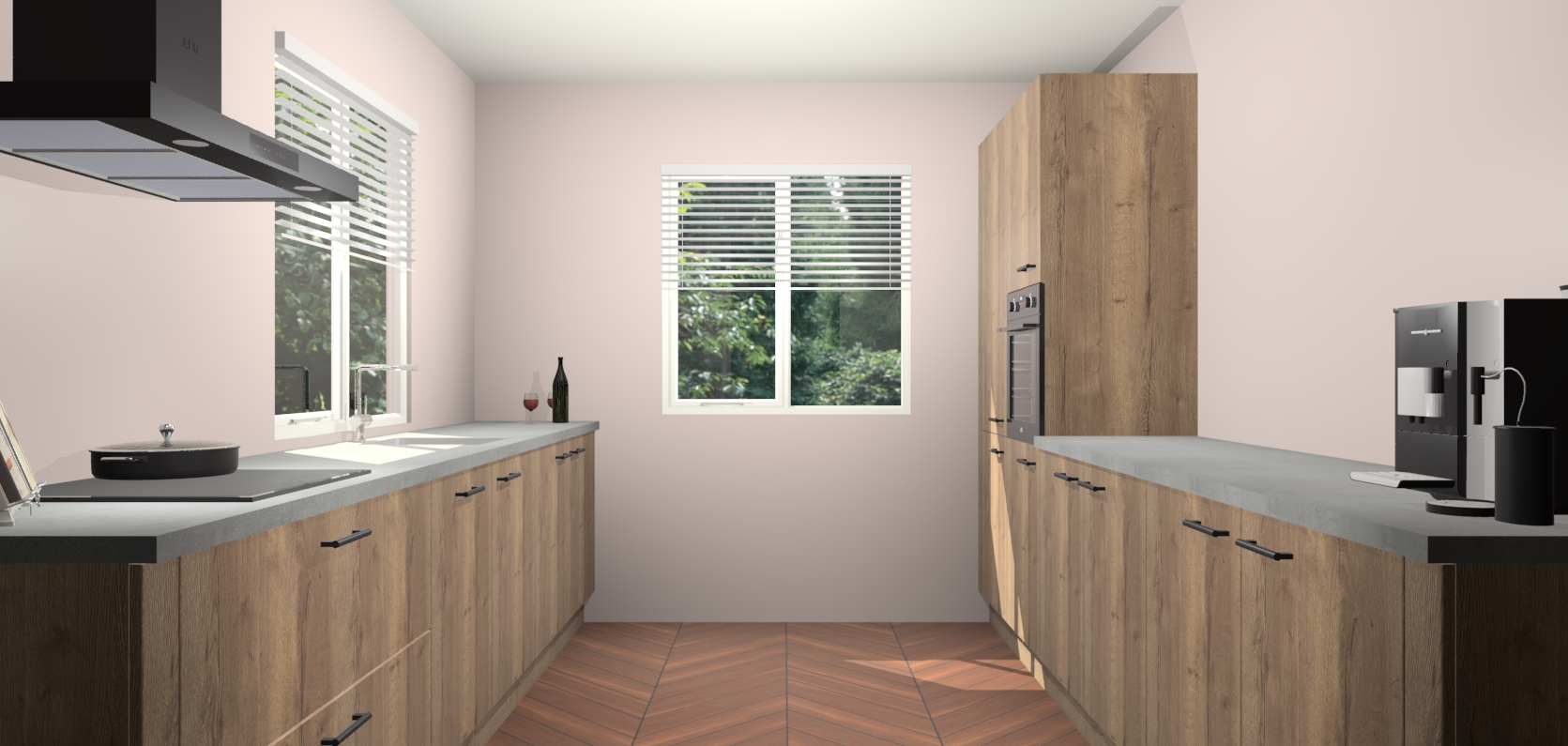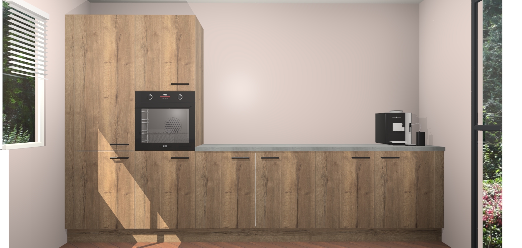 Welkom bij de Chocolade Eiken keuken Lusaka. Deze prachtige keuken zal de komende jaren het middelpunt van de belangstelling in uw huis zijn. Uitgerust met vijf inbouwapparaten komt u nooit kookgereedschap tekort. Bovendien geeft de warme houtlook elke ruimte een uitnodigende en tijdloze uitstraling.