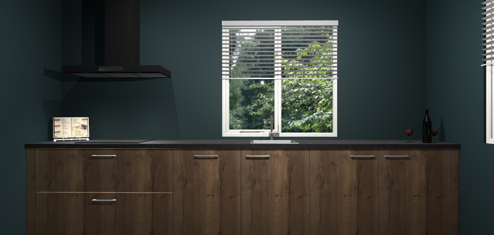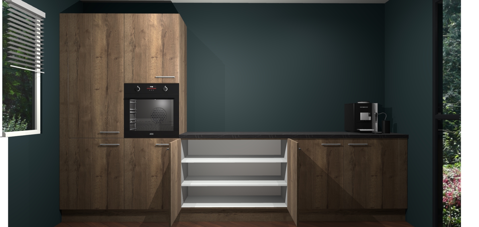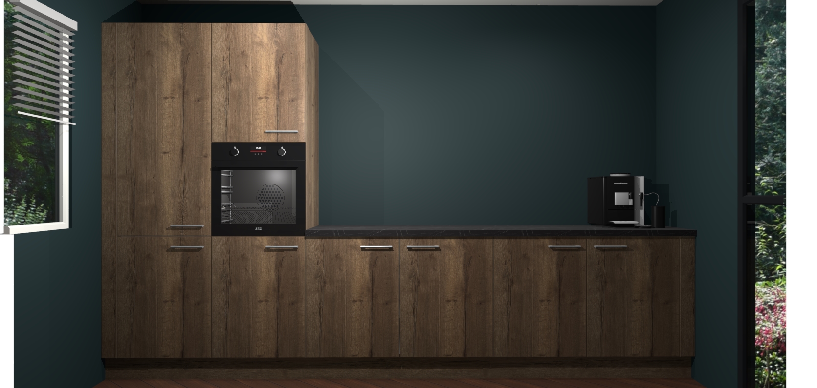 Welkom bij de Chocolade Eiken keuken Lusaka. Deze prachtige keuken zal de komende jaren het middelpunt van de belangstelling in uw huis zijn. Uitgerust met vijf inbouwapparaten komt u nooit kookgereedschap tekort. Bovendien geeft de warme houtlook elke ruimte een uitnodigende en tijdloze uitstraling.