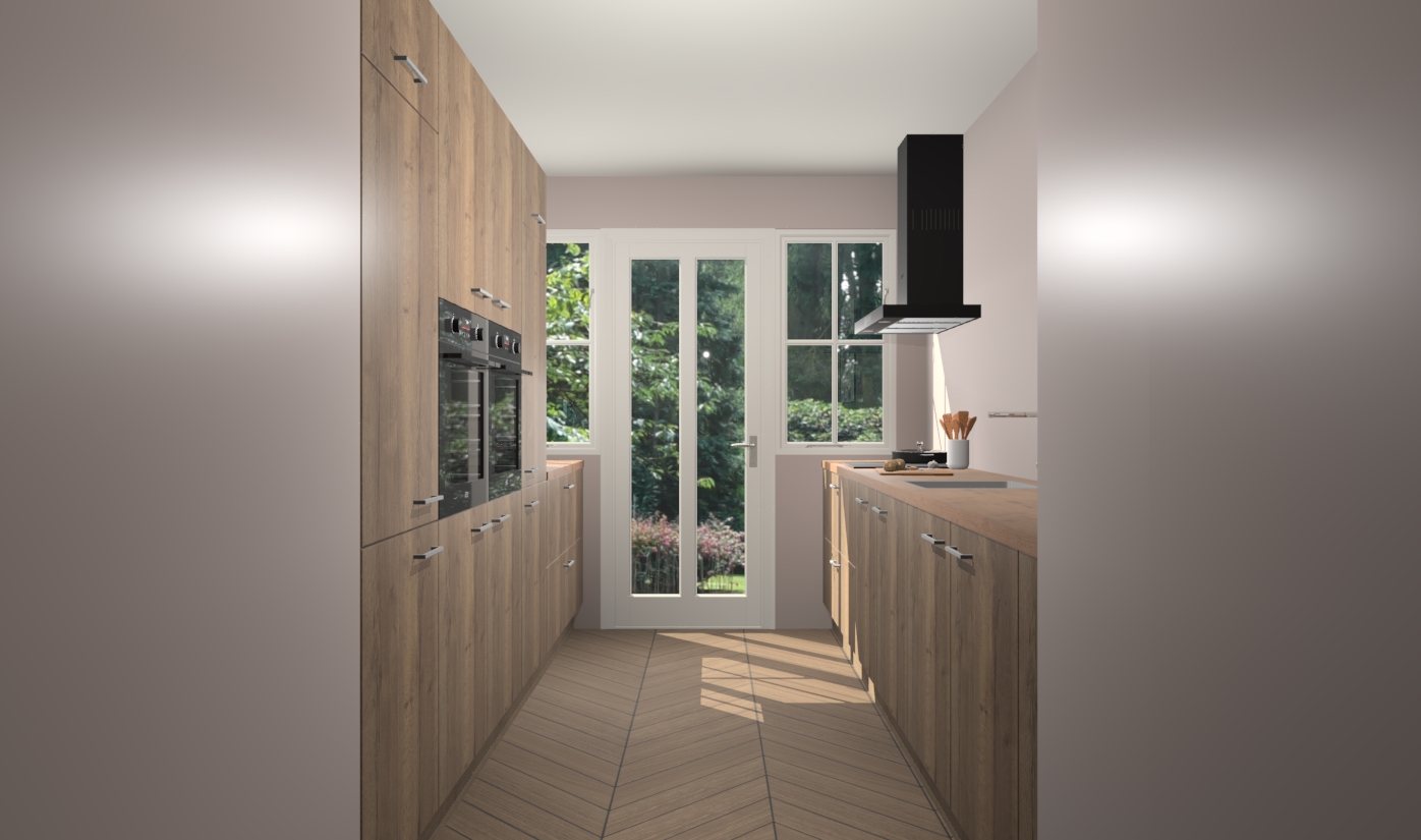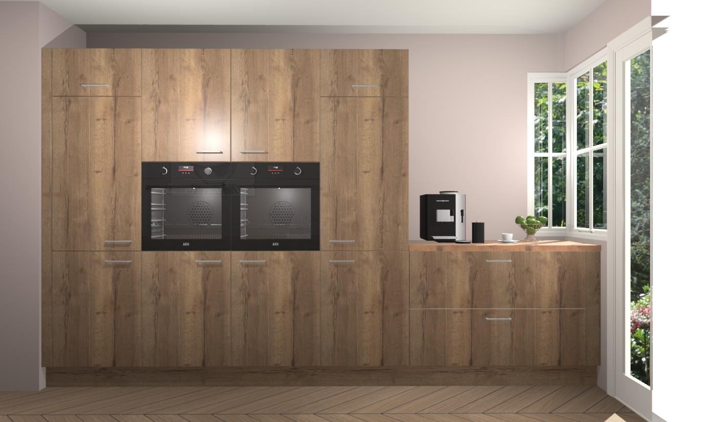 Een stijlvolle en praktische keuken als deze mag gezien worden. Dankzij de prachtige chocolade eiken matte afwerking wordt de keuken gemakkelijk het middelpunt van uw huis - hij ziet er geweldig uit onder allerlei lichtomstandigheden, van dag tot nacht!