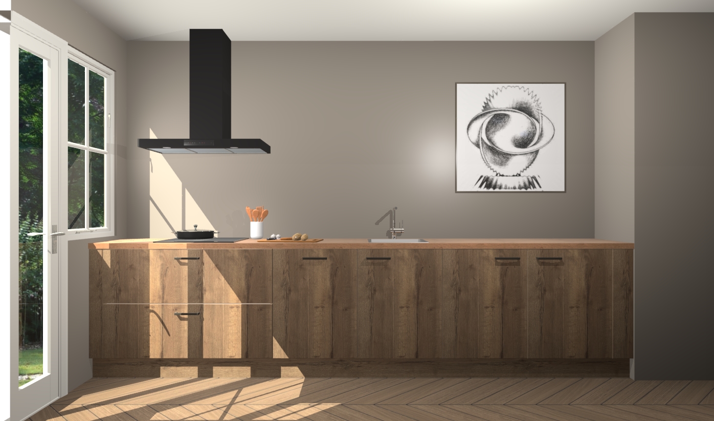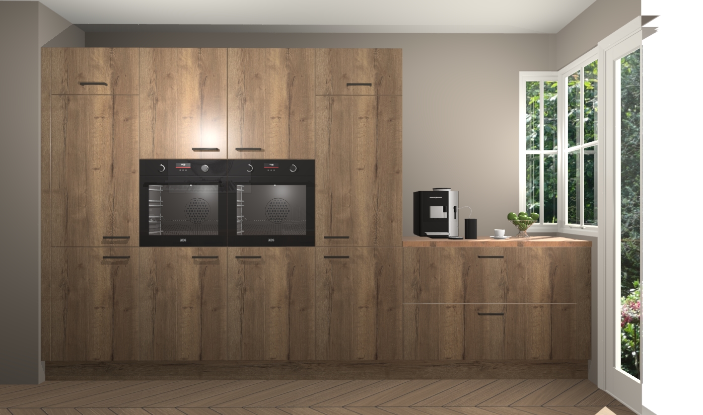 Een stijlvolle en praktische keuken als deze mag gezien worden. Dankzij de prachtige chocolade eiken matte afwerking wordt de keuken gemakkelijk het middelpunt van uw huis - hij ziet er geweldig uit onder allerlei lichtomstandigheden, van dag tot nacht!