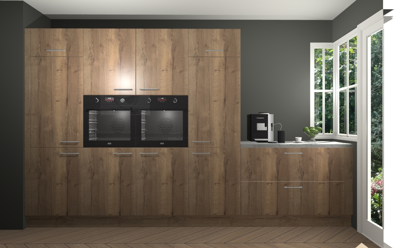 Een stijlvolle en praktische keuken als deze mag gezien worden. Dankzij de prachtige chocolade eiken matte afwerking wordt de keuken gemakkelijk het middelpunt van uw huis - hij ziet er geweldig uit onder allerlei lichtomstandigheden, van dag tot nacht!