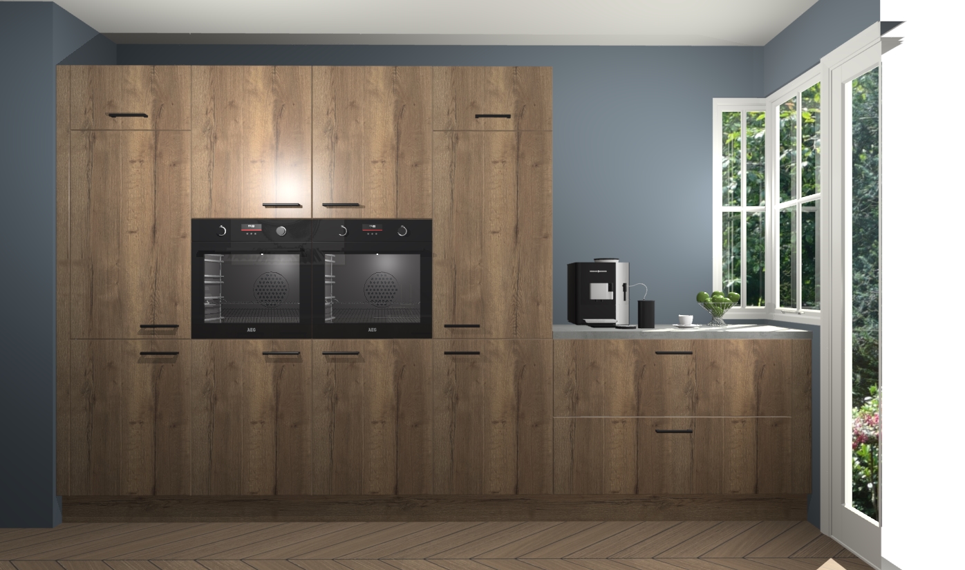 Een stijlvolle en praktische keuken als deze mag gezien worden. Dankzij de prachtige chocolade eiken matte afwerking wordt de keuken gemakkelijk het middelpunt van uw huis - hij ziet er geweldig uit onder allerlei lichtomstandigheden, van dag tot nacht!