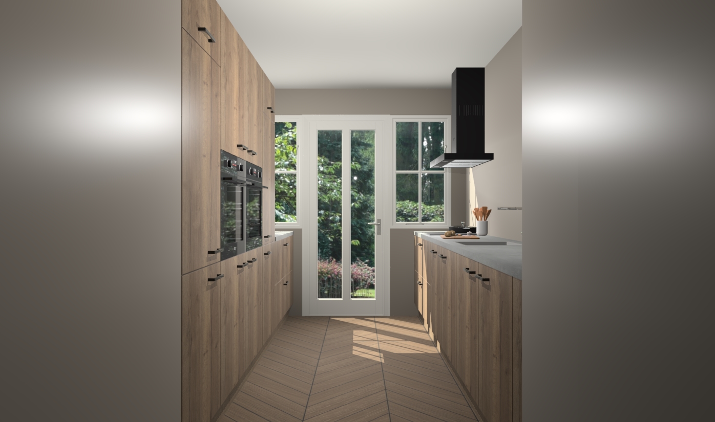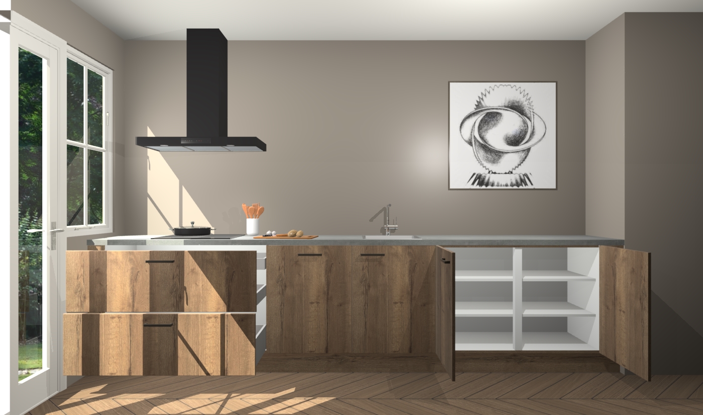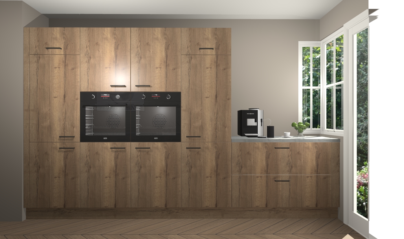 Een stijlvolle en praktische keuken als deze mag gezien worden. Dankzij de prachtige chocolade eiken matte afwerking wordt de keuken gemakkelijk het middelpunt van uw huis - hij ziet er geweldig uit onder allerlei lichtomstandigheden, van dag tot nacht!