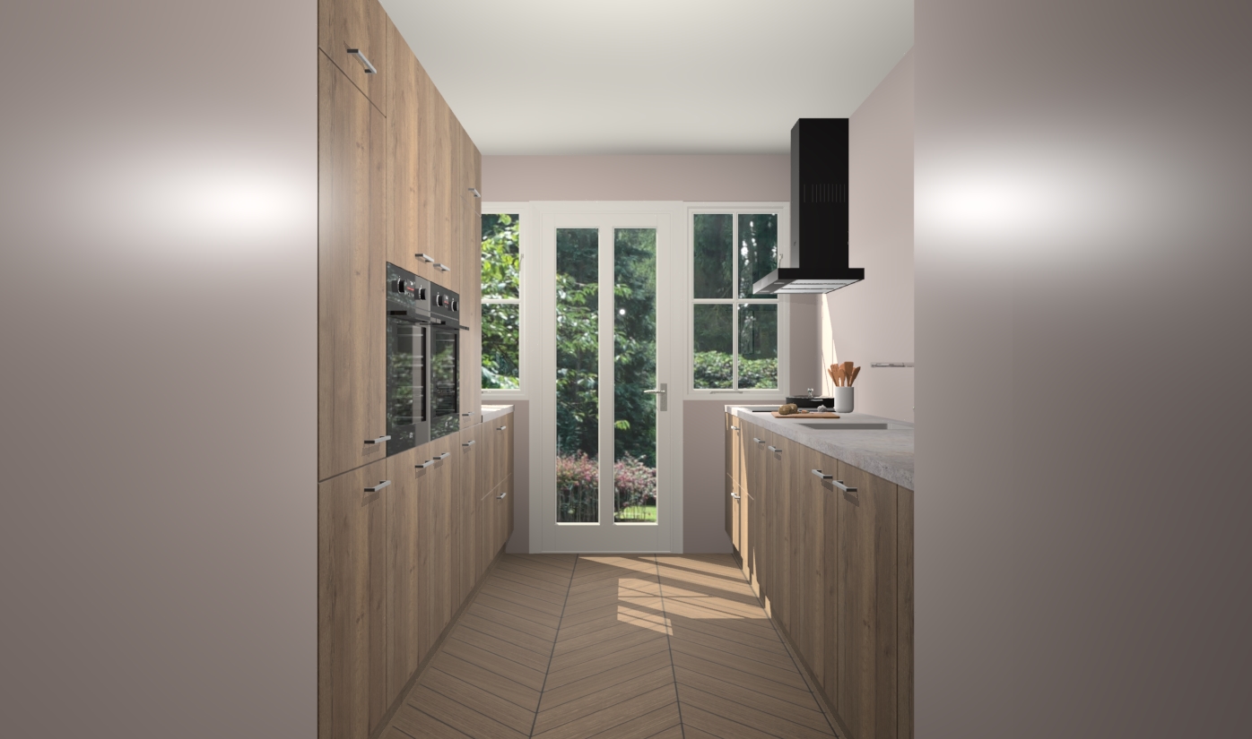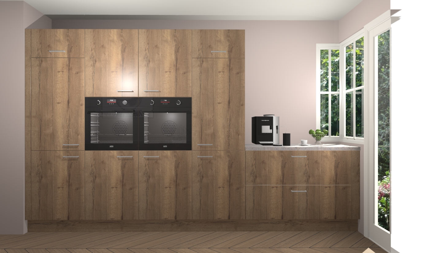 Een stijlvolle en praktische keuken als deze mag gezien worden. Dankzij de prachtige chocolade eiken matte afwerking wordt de keuken gemakkelijk het middelpunt van uw huis - hij ziet er geweldig uit onder allerlei lichtomstandigheden, van dag tot nacht!