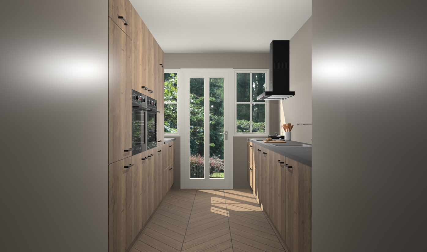 Een stijlvolle en praktische keuken als deze mag gezien worden. Dankzij de prachtige chocolade eiken matte afwerking wordt de keuken gemakkelijk het middelpunt van uw huis - hij ziet er geweldig uit onder allerlei lichtomstandigheden, van dag tot nacht!