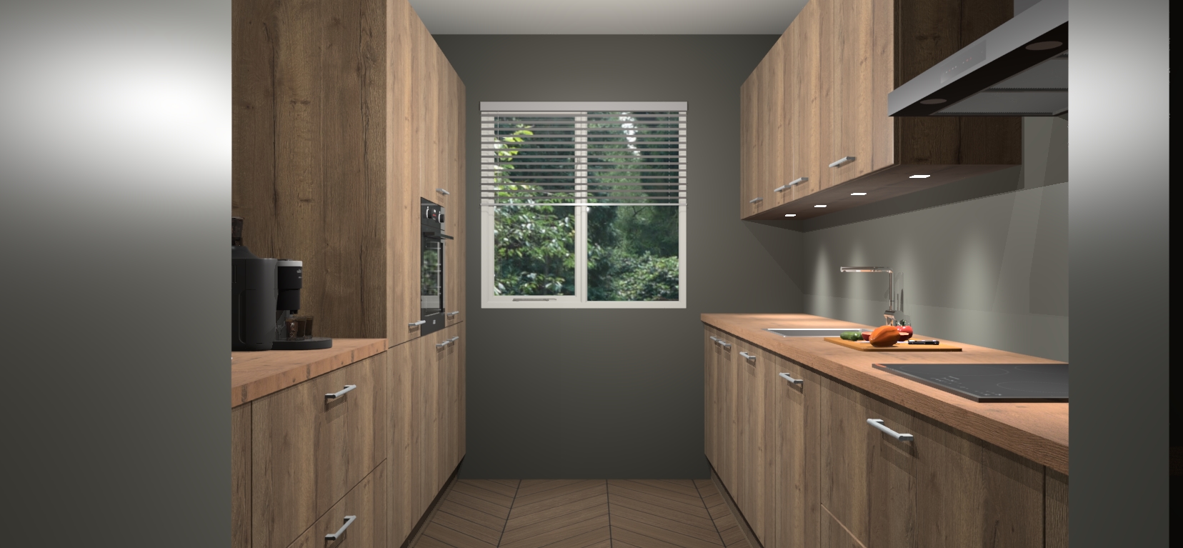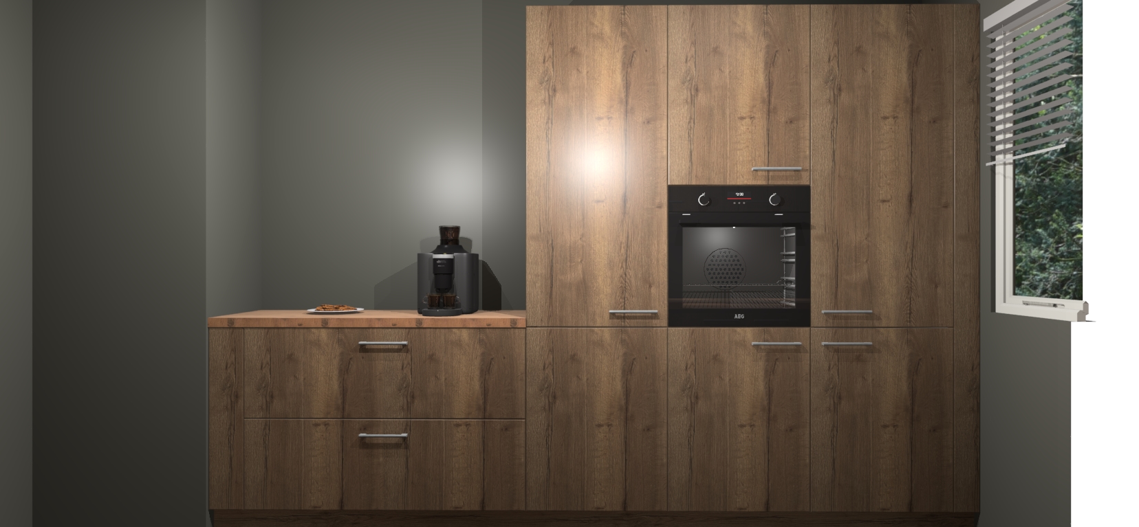 Een stijlvolle en praktische keuken als deze mag gezien worden. Dankzij de prachtige Chocolade Eiken matte afwerking wordt de keuken gemakkelijk het middelpunt van uw huis - hij ziet er geweldig uit onder allerlei lichtomstandigheden, van dag tot nacht!