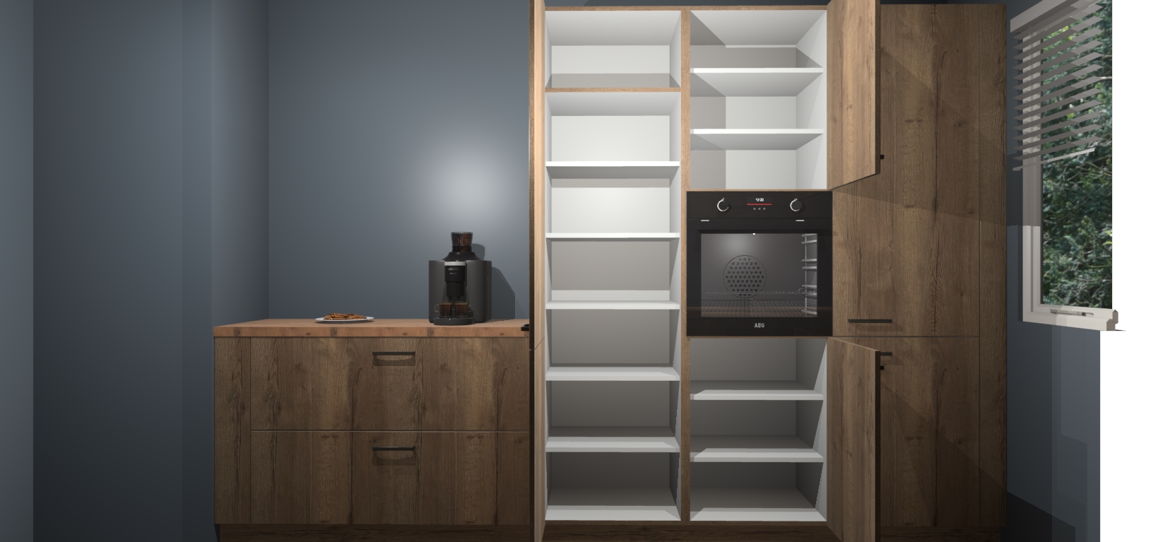 Een stijlvolle en praktische keuken als deze mag gezien worden. Dankzij de prachtige Chocolade Eiken matte afwerking wordt de keuken gemakkelijk het middelpunt van uw huis - hij ziet er geweldig uit onder allerlei lichtomstandigheden, van dag tot nacht!