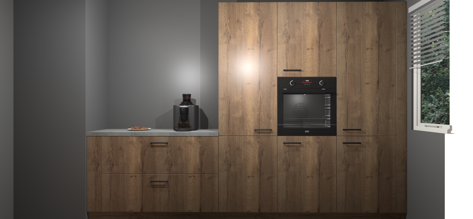 Een stijlvolle en praktische keuken als deze mag gezien worden. Dankzij de prachtige Chocolade Eiken matte afwerking wordt de keuken gemakkelijk het middelpunt van uw huis - hij ziet er geweldig uit onder allerlei lichtomstandigheden, van dag tot nacht!