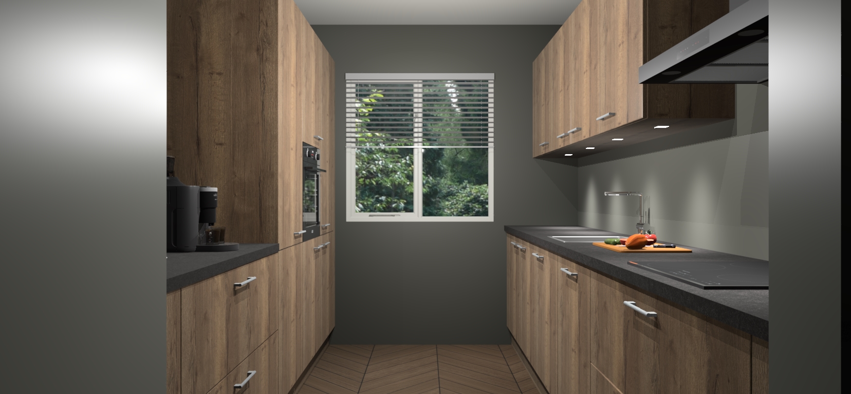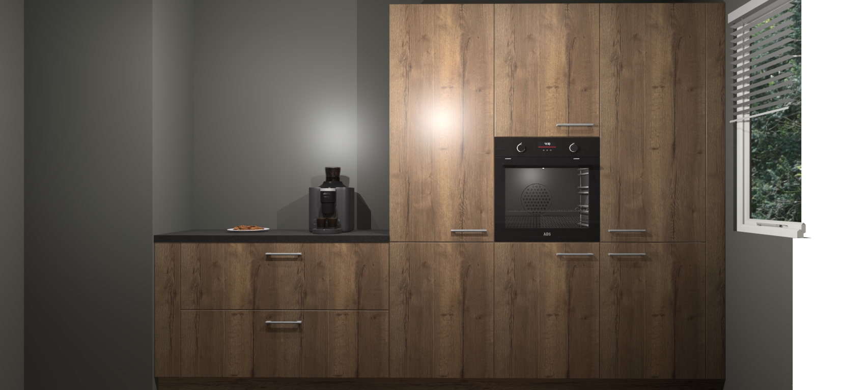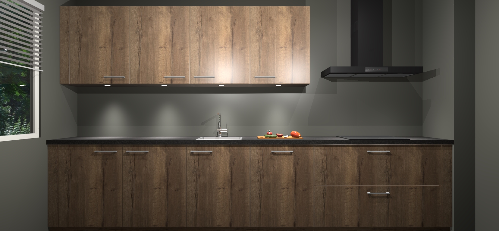 Een stijlvolle en praktische keuken als deze mag gezien worden. Dankzij de prachtige Chocolade Eiken matte afwerking wordt de keuken gemakkelijk het middelpunt van uw huis - hij ziet er geweldig uit onder allerlei lichtomstandigheden, van dag tot nacht!