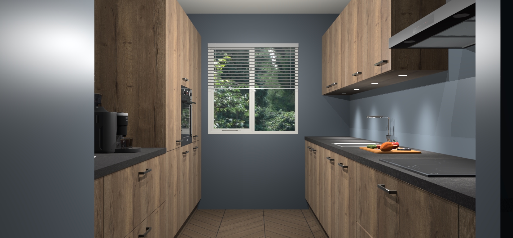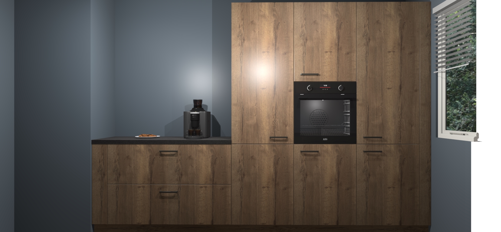 Een stijlvolle en praktische keuken als deze mag gezien worden. Dankzij de prachtige Chocolade Eiken matte afwerking wordt de keuken gemakkelijk het middelpunt van uw huis - hij ziet er geweldig uit onder allerlei lichtomstandigheden, van dag tot nacht!